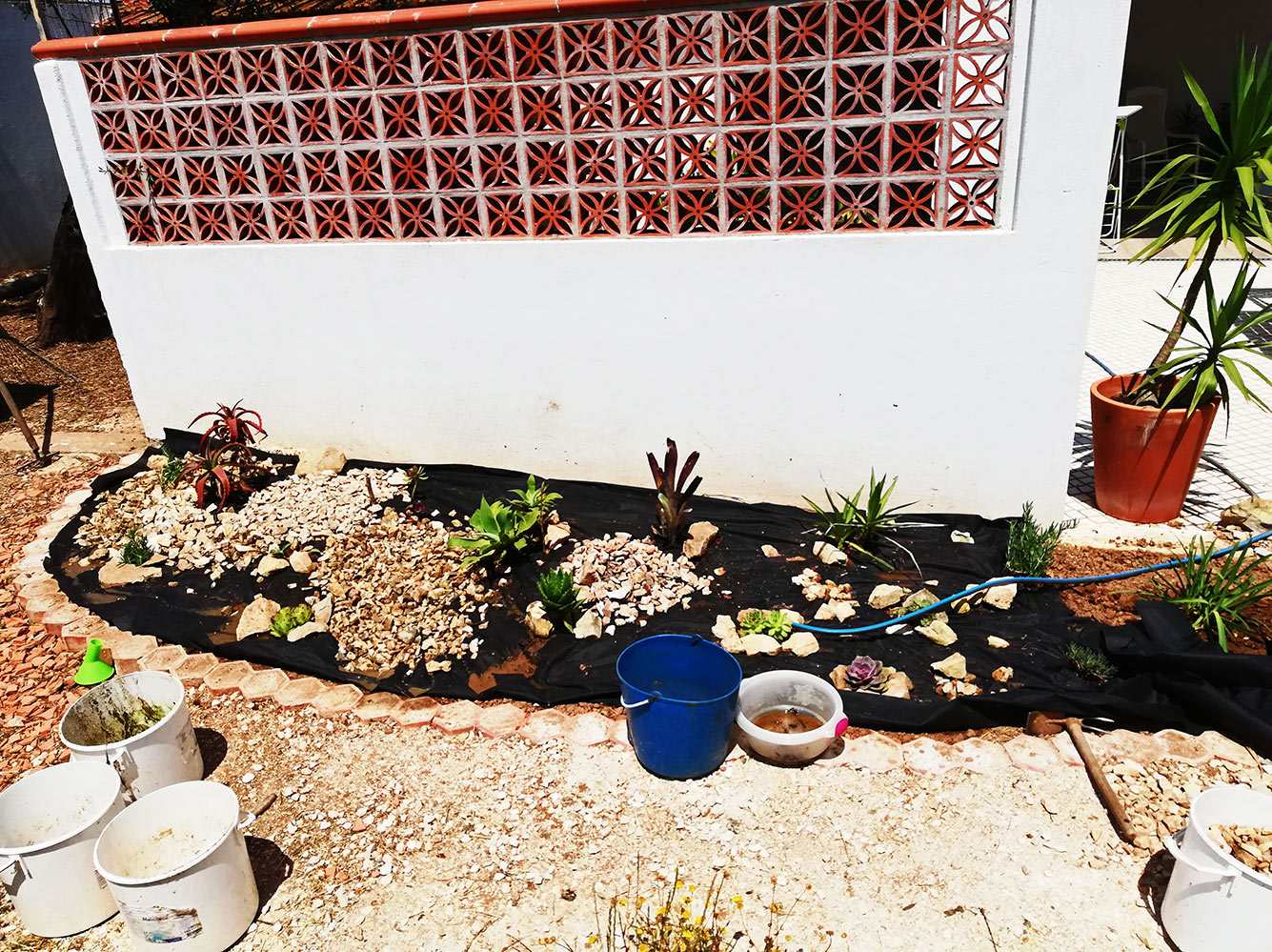 Voor ons een goede gelegenheid om de rotstuin die daar gepland is verder af te maken. Helaas moet dan eerst de helft die al klaar was verder schoongemaakt worden, want we gaan er anti-worteldoek onder doen. Alle stenen moeten er vanaf, anti-worteldoek leggen, gaten voor de planten in de grond en in het doek. De gaten in het doek is lekker makkelijk, maar de gaten in de grond zijn een bezoeking. Alles is kurkdroog en daardoor wordt de grond zo hard als steen. Bikken dus. Maar het lukt, het doek is gelegd, de planten zitten erin en de stenen grotendeels weer terug.