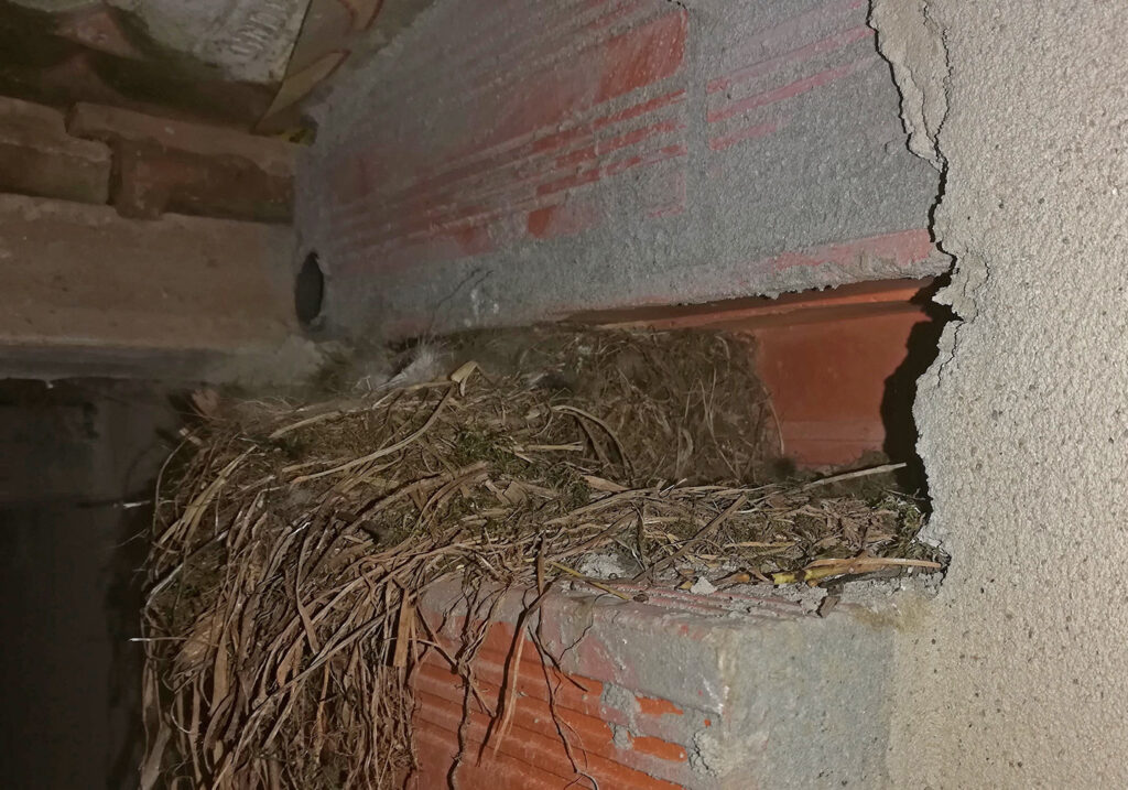 Toen we de muur gingen bouwen tussen het hooihok en het geiten/kippenhok hebben we rekening gehouden met het nestje van de zwarte roodstaartjes. Vorig hadden we een nestje met een paar jongen, maar waarschijnlijk zat dat te dicht onder de pannen waar het erg warm wordt als de zon erop schijnt. Die hebben het toen niet overleefd. Het nestje moesten we weghalen voor de muur, maar in de muur hebben we wat lager een nisje gemaakt en daar het nestje weer in teruggelegd. Het vogelpaartje heeft het weer teruggevonden en er meteen maar een extensie aan gemaakt. De ruimte was er toch! Afgelopen week hebben we de jonkies horen piepen, waarschijnlijk zijn ze uit het ei gekomen toen wij nog in Nederland zaten.