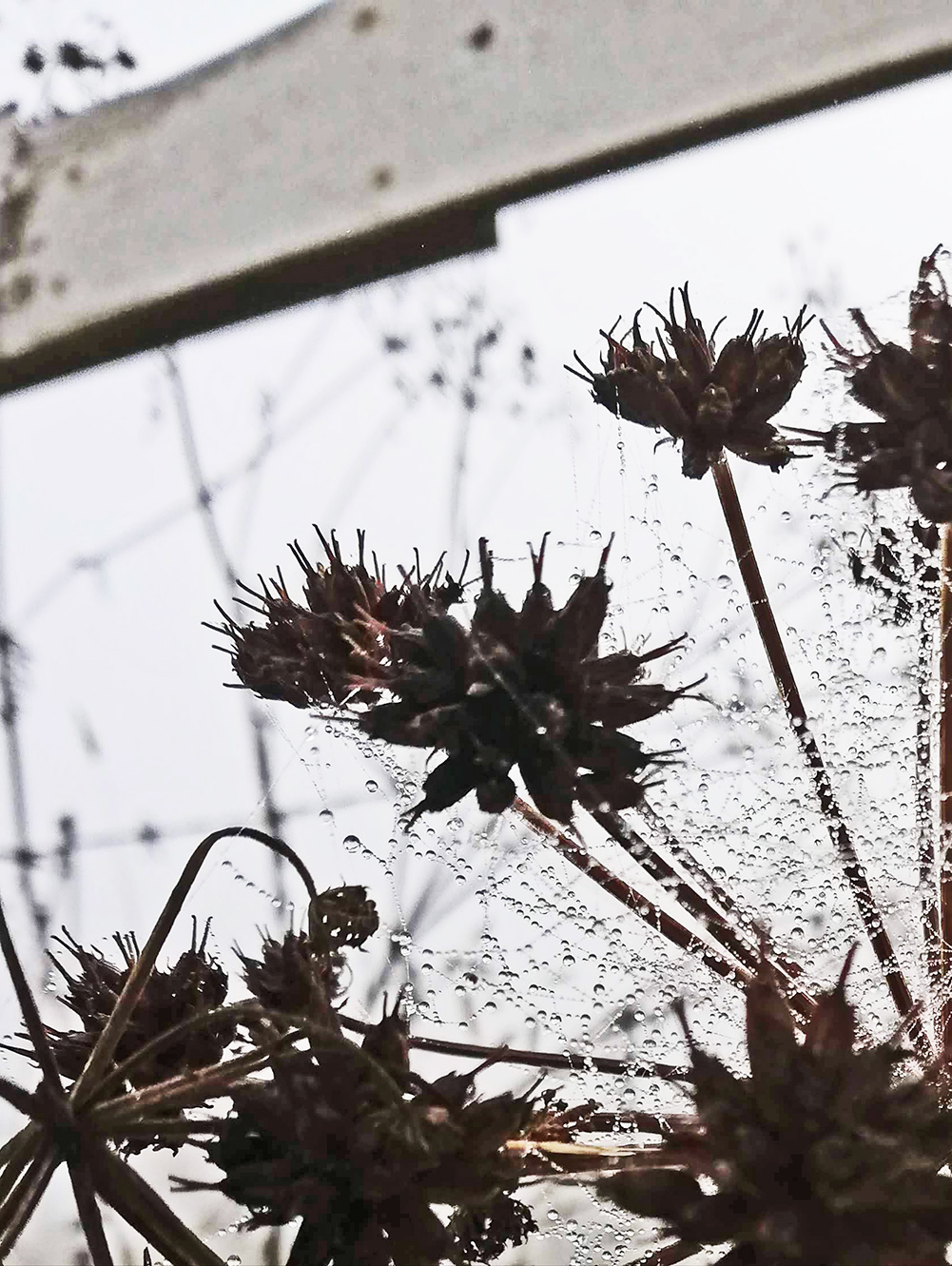 We hebben een warme periode, een paar dagen achter elkaar met temperaturen boven de 30°C. ’s Ochtends begint de dag met mist en is van de zon nog weinig te zien. Er zit zoveel vocht in de lucht dat het overal neerslaat. De bomen regenen, de grond is nat. En in de uitgedroogde bloemen, die nu zaadbollen zijn geworden, zie je de spinnenwebben ineens erg goed zitten met al die kleine druppeltjes. Het is bijna poëtisch. Rond negen uur, half tien is de zon krachtig genoeg om door de mist heen te komen. De mist lost dan heel snel op en ineens zitten we onder een strakblauwe hemel, geen wolkje te zien.