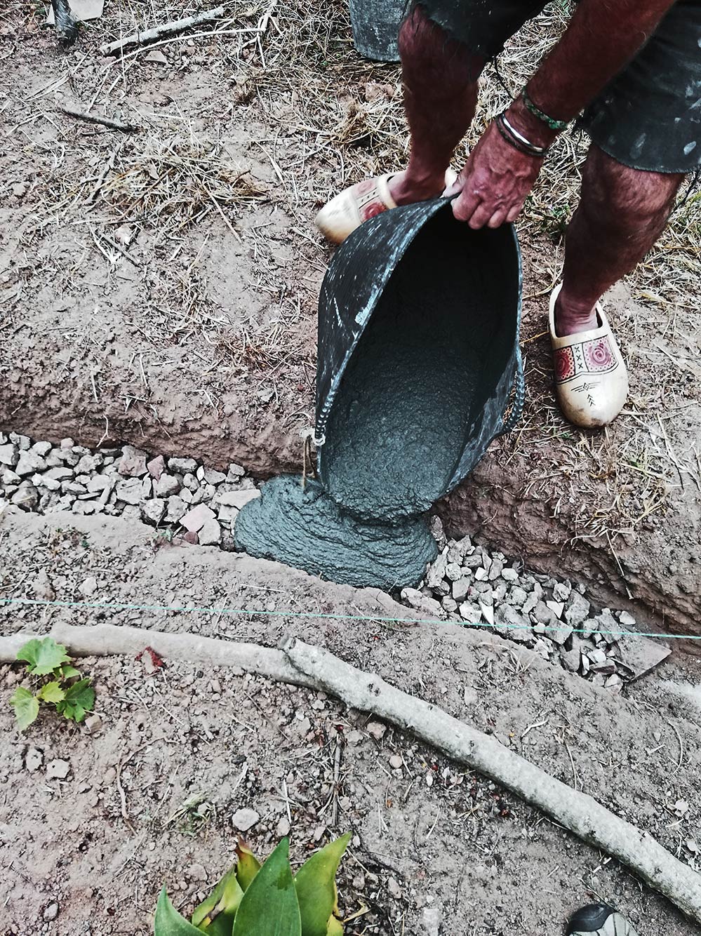 De kippen houden zich nu wat meer afzijdig, als je aan het graven bent dan steken ze letterlijk hun neus, nou ja hun snavel dan, overal tussen, en je moet uitkijken of je ze niet de kop afhakt als je net een wortel aan het doorhakken bent. Ze vinden altijd wat, ook als je al 20 cm diep zit. Maar goed dat is nu achter de rug, nu is het zaak een mooie cementen rand te storten waar we straks een laag stenen op kunnen zetten.