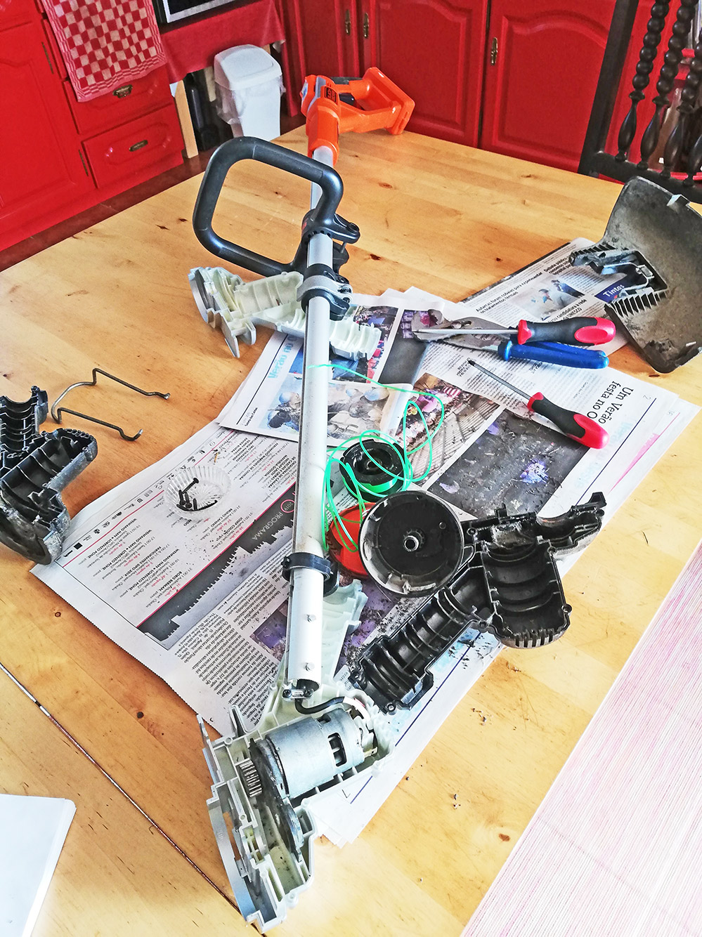 De grastrimmer had het begeven. De kop zat zo scheef dat het tandwiel van de kop het tandwiel van de motor niet meer raakte. Geen beginnen aan dus. Nu bleek een gedeelte van het motorhuis zo versleten te zijn dat de kop niet meer op zijn plaats gehouden werd. Zou dat garantie zijn. Even gebeld met Amazon, waar het ding vandaan komt. Die geeft helaas maar twee jaar garantie en het ding is 26 maanden oud. Zul je altijd zien. Ook de leverancier houdt het op die twee jaar. Er is een firma in Nederland die onderdelen verkoopt en een nieuw motorhuis is te verkrijgen voor nog geen twee tientjes! Daar koop je geen nieuwe trimmer voor. Het ding is besteld, kwam een paar dagen voor Marijns vertrek en het paste ook nog in zijn handbagagekoffer. Is dat geen mazzel?