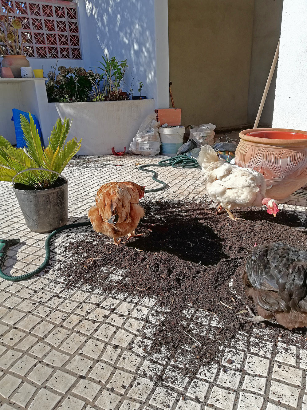 In de alpendre staat een zogeheten Vredespalm (voor de liefhebbers Cycas Revoluta). Het was net of de plant het niet lekker deed, door de zon, door een te kleine pot, te weinig water, te veel wind. Een beetje onduidelijk. Daarom het plan opgevat de plant in een grotere pot te zetten, wat voeding te geven en misschien wat uit de zon houden als het het warmst van de dag is. Bij het verpotten zagen we al gauw wat krioelen in de aarde. Het zijn de larven van een of andere kever. We hebben de pot omgedraaid en de hulptroepen ingeschakeld. Die zijn zo effectief! In een mum van tijd een stuk of dertig van die larven gevonden en opgevreten, ze hoeven er niet lang over na te denken. Zo gauw ze zijn gekomen, zo gauw zijn de hulptroepen ook weer weg als er niets meer te halen valt.