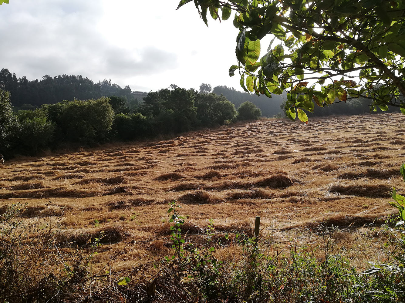 De overbuurman is aan het hooien geslagen. Een tijdje geleden is er gemaaid en nu is het kennelijk tijd om het gemaaide spul binnen te halen. Als eerste wordt er dan een tractor met van die ronddraaiende bladharken op het veld losgelaten. En als altijd is er weer een verhaal bij. De tractor stopte plotseling en de man die hem bestuurde stond erbij met de pet in de hand en op zijn achterhoofd krabbend. Hij liep naar de rand van het veld en we vroegen nog of hij hulp nodig had. Hij snapte er ook niets van, er was genoeg brandstof, maar het ding stopte plotseling. Hij hoefde niet naar huis gebracht, zijn collega’s kwamen hem halen en grijnzend en wijd gebarend gaf hij aan geen hulp nodig te hebben. Een dag later kwam er een ploeg van een man of wat die de tractor bekeek probeerde te starten en zo. Na een uur en wat magische handelingen deed het ding het weer en kon het veld verder bewerkt worden. Het resultaat is rijen van stro op het land die waarschijnlijk later tot strobaal verwerkt gaan worden.