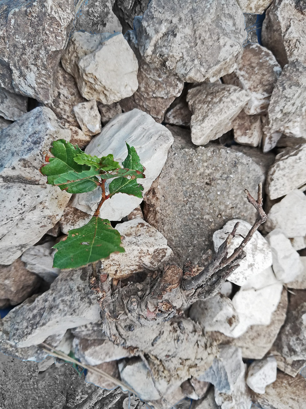 Het lijkt of dit plantje tussen de keien groeit. Niets is minder waar, als je goed kijkt ligt het met wortelstok en al op een stapel stenen. Vandaag maar eens de stoute schoenen aangetrokken (kwaadaardige klompen?) om het voorterrein te ontdoen van allerlei planten die we daar liever niet hebben. Bijvoorbeeld bramen, die komen overal uit de grond en nemen het hele terrein over als je niet uitkijkt. En de Portugese Eik, dat is echt een sterke plant. Hijs beschermd in Portugal en dat betekent dat als hij te hoger wordt da 60cm hij niet meer verwijderd mag worden. Raar dat-ie beschermd is, want hij is oersterk. Misschien een soort nationalisme? Hij vermeerdert zich in ieder geval erg makkelijk: door eikels te laten vallen en die lopen dan uit, of onder de grond door vanuit de wortel een nieuw boompje te starten. Als het terrein alleen gemaaid wordt dan zijn de planten wel weg, maar de wortel zit nog in de grond en daar komt weer een nieuwe plant op terwijl de wortel dikker wordt. En als je dan bedenkt dat er de afgelopen tientallen jaren er alleen gemaaid is… Daar doen we zelf ook aan mee, want echt op eikenjacht zijn we nog niet gegaan. Nanouk en Seb, onze vrijwilligers van september vorig jaar hebben er wel wat uitgehaald en nu zijn we zelf ook begonnen.