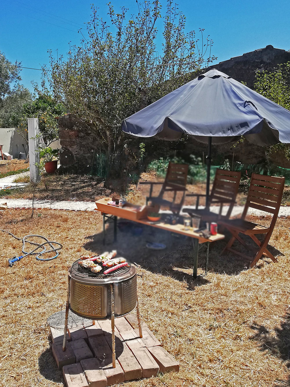 Gauw een platformpje gemaakt om de barbecue op te zetten, tegen het vlamvatten van het droge gras, de tuinslang bij de hand voor als het toch een beetje mis gaat.