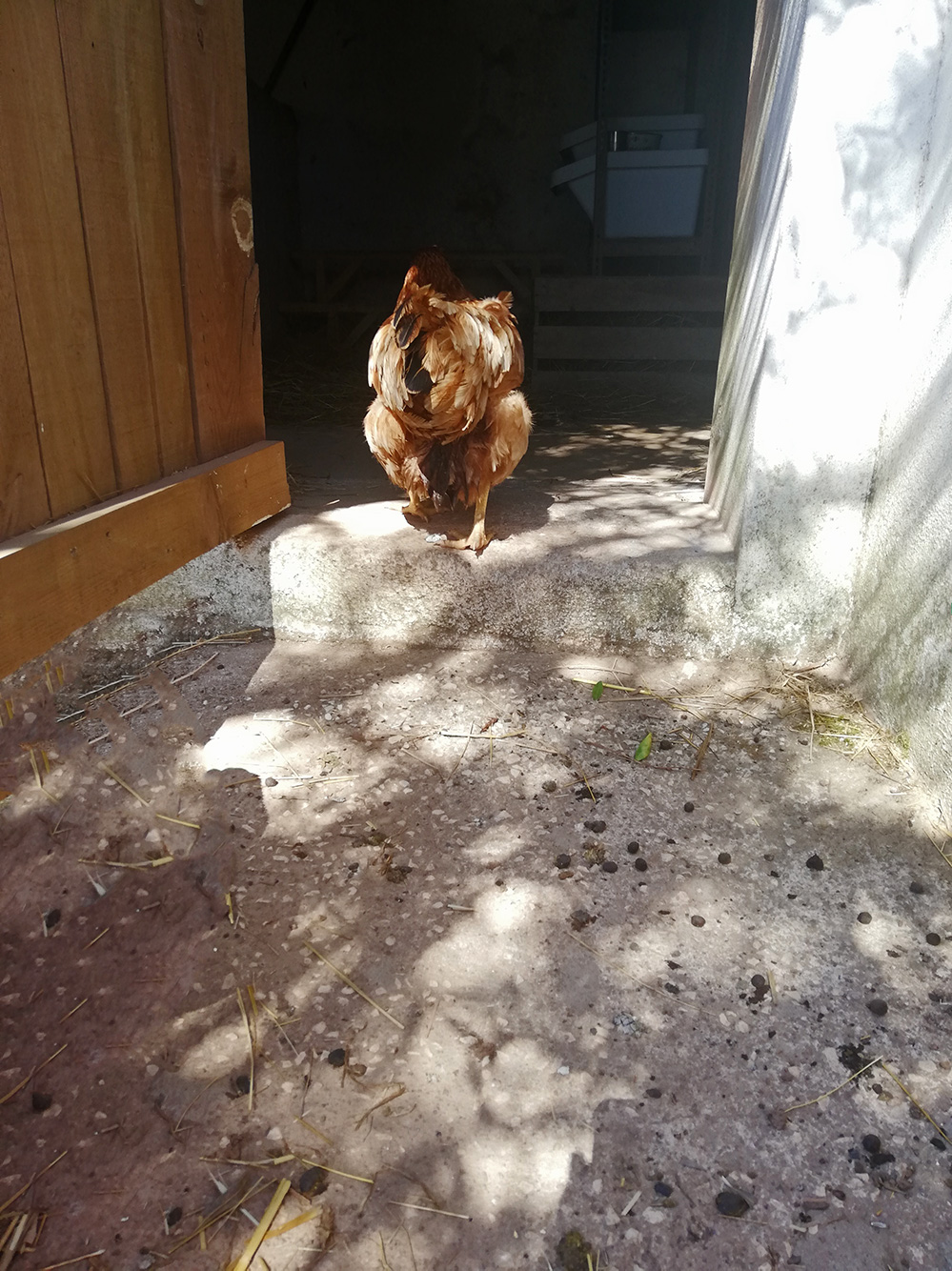 Pinóquia geeft al een paar dagen een erg timide indruk, eet wel, scharrelt wel en drinkt wel, maar ze is bij lange na niet zo alert als dat ze normaal gesproken is. We hebben haar apart gezet (in quarantaine), voor het geval ze iets besmettelijks zou hebben en de andere kippen zou aansteken. De ontlasting is erg waterig. Niet goed. Bij nadere inspectie bleek de cloaca vergeven te zijn van de maden, en als die buiten zitten, zitten ze binnen ook. Het arme dier wordt levend opgegeten. Wat nu te doen. De enige oplossing is eigenlijk haar uit haar lijden te verlossen want de kans op verbetering en genezing is nihil. Maar ja, zelf doen is geen optie, want nog nooit gedaan en dan is er alleen de kans op vergroten van het lijden. Dan maar bij de buren vragen. Mattias is onze nieuwe buurman en die stond net op het punt weg te gaan, om een rondje te gaan rijden. Gelukkig was hij bereid mee te komen. We hebben een gat gegraven en Mattias heeft Pinóquia geholpen. Heel netjes, ze heeft geen kik gegeven. Gelukkig maar.