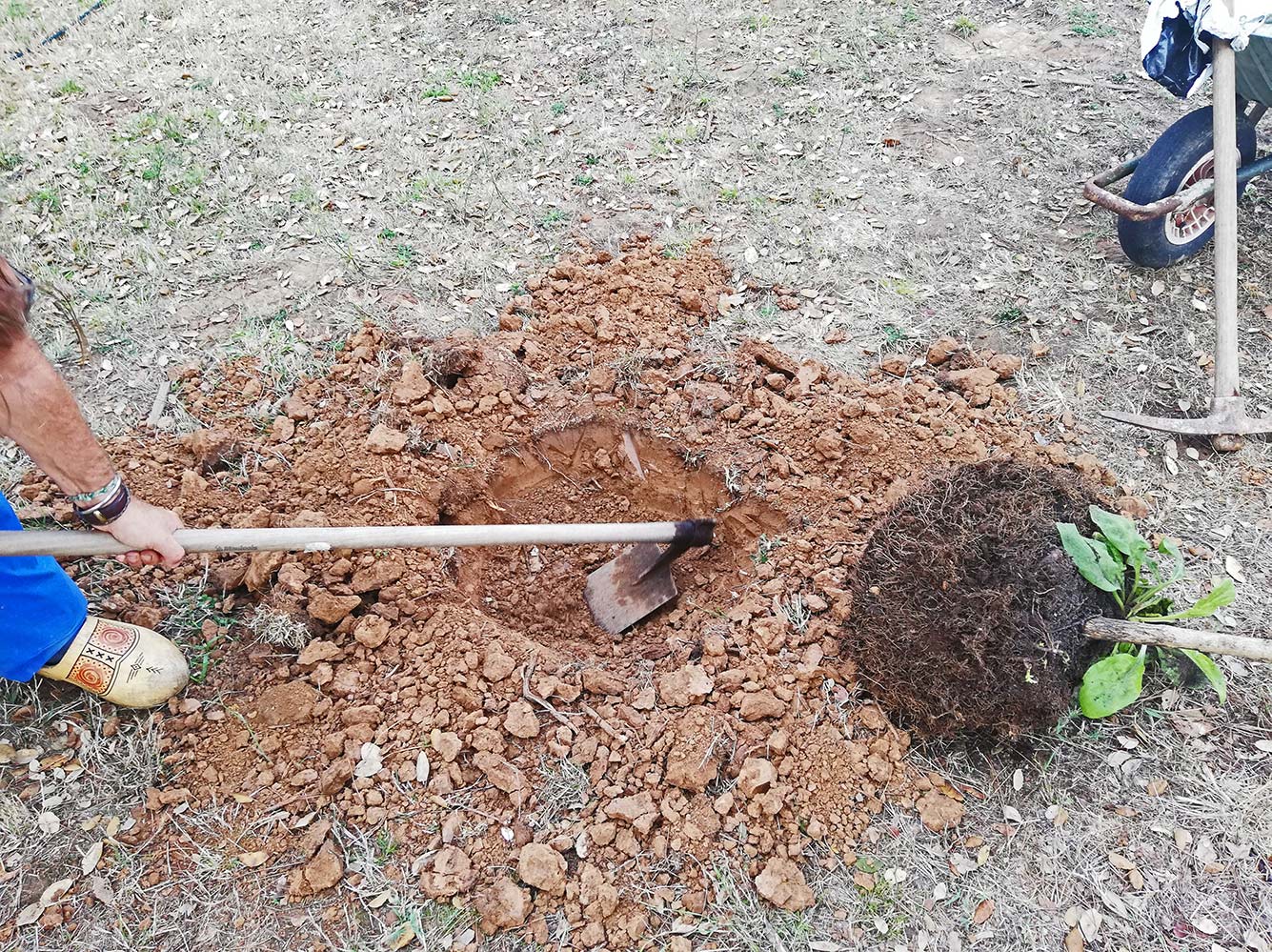 Naast de dozen met allerlei spullen zijn er ook wat planten meegekomen uit Nederland. Een paar in potjes, een klimroos en frambozen. Maar het topstuk is wel een schoot van de sering uit de Raafstraat. Hij staat al bijna een jaar te wachten in een grote pot en hij heeft zelf ook al een paar schoten gemaakt. Nu dan, na een reis van meer dan 2000km en een paar dagen in een plastic zak, gaat de plant nu de grond weer in. Daartoe moet er wel een gat gegraven worden, wat niet zo eenvoudig is in de harde grond die we op het terrein hebben. Na een periode van droogte is de grond hard als steen en valt er met een gewone spade of een hak niet doorheen te komen. Gelukkig hebben we vorige week een paar dagen regen gehad en valt er nog wel een beetje te graven. Voor een gat van zo’n veertig centimeter diep en een halve meter in doorsnee zijn we al gauw een uurtje bezig. We doen dat bij toerbeurt om de hartslag niet al te hoog te laten worden. Uiteindelijk staat het boompje fier op het terrein. De kluit was nog genoeg intact waardoor het blad niet verdord is. Het staat er nu alsof het er altijd al gestaan heeft. En nu afwachten of het voldoende aanslaat dat we volgend jaar de bloei kunnen meemaken.