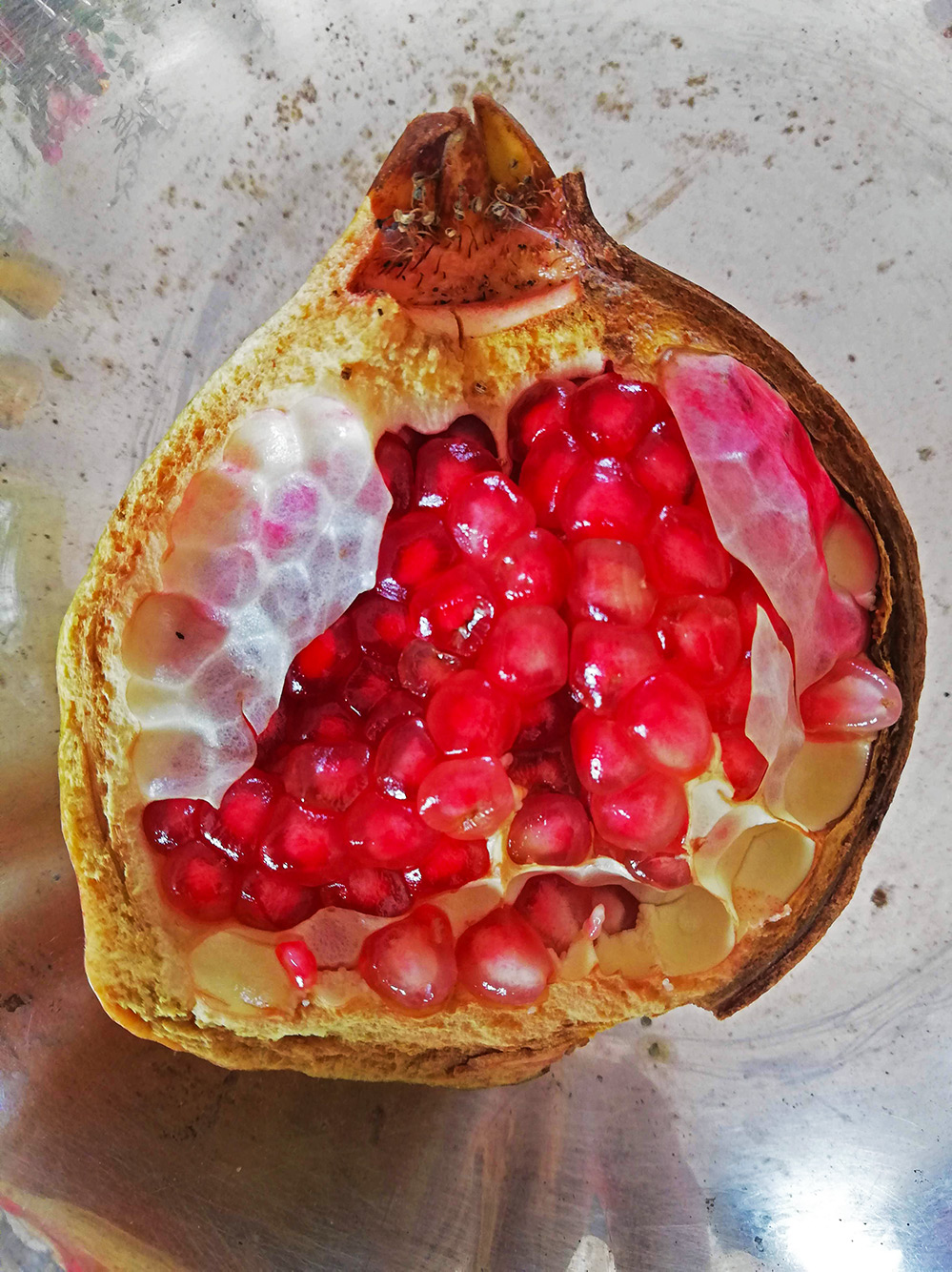 Als gezegd, het is een slecht fruitjaar. We hebben geen abrikozen, geen pruimen, slechts een paar peren. De appelboom heeft zegge en schrijve één appel opgeleverd die door Lourdes Maria is opgegeten. De vijgenbomen zitten stampvol, maar de vijgen smaken nergens naar, te veel regen of zo. De diospyros doet het wel goed, die heeft vruchten. Én de granaatappelboom, die heeft een paar vruchten waarvan er eentje rijp genoeg is om geplukt te worden. Er komen er nog meer, maar dat is nog even afwachten.