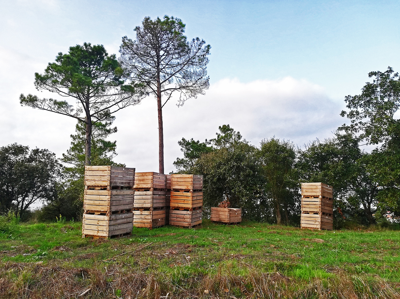 Het seizoen voor de appelpluk is al een tijdje achter de rug. Aan de appelbomen hangt hier en daar nog een verdwaalde appel, die overgeslagen is tijdens het plukken. De kratten waarin de appels verzameld worden staan er nog, niet allemaal, de meeste zijn weg. Maar deze zestien staan er nog. Hadden ze een grotere oogst verwacht? Zijn ze deze gewoon vergeten? Of gebruikt de eigenaar van de bomen het land als opslagplaats? We weten dat het land niet van dezelfde eigenaar is. We weten dat het land van de appelbomen van Senhor Vitor is, die we elke ochtend tegenkomen met Cané, zijn hondje. De bomen zelf zijn van iemand anders en het land waar de kratten staan is wéér van iemand anders, die wel weer in Casal da Marinha woont.