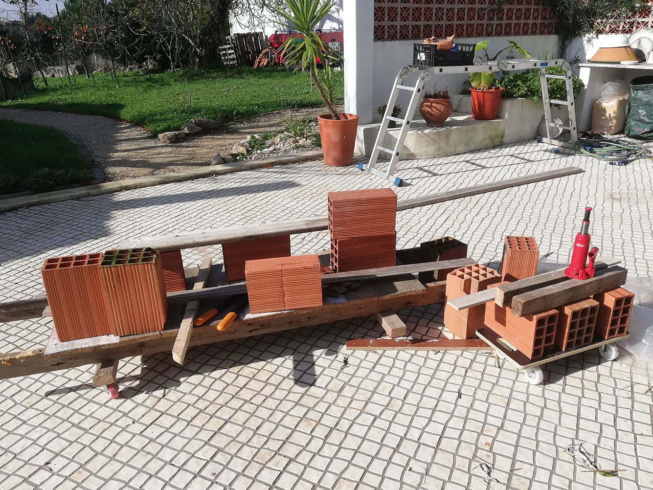 De wastafel staat op zijn plaats en nu moet er weer opgeruimd worden. Alles zo bij elkaar neergezet maakt een stilleven. Niet dat de zeventiende-eeuwse schilders er meteen warm voor zouden lopen, maar het is toch een grappig gezicht. De zelfgemaakte kar, het hondje, de krik, de terracotta stenen, de planken en balkjes. Ze staan allemaal als een soort partners in crime bij elkaar, een beetje na te genieten in de zon.