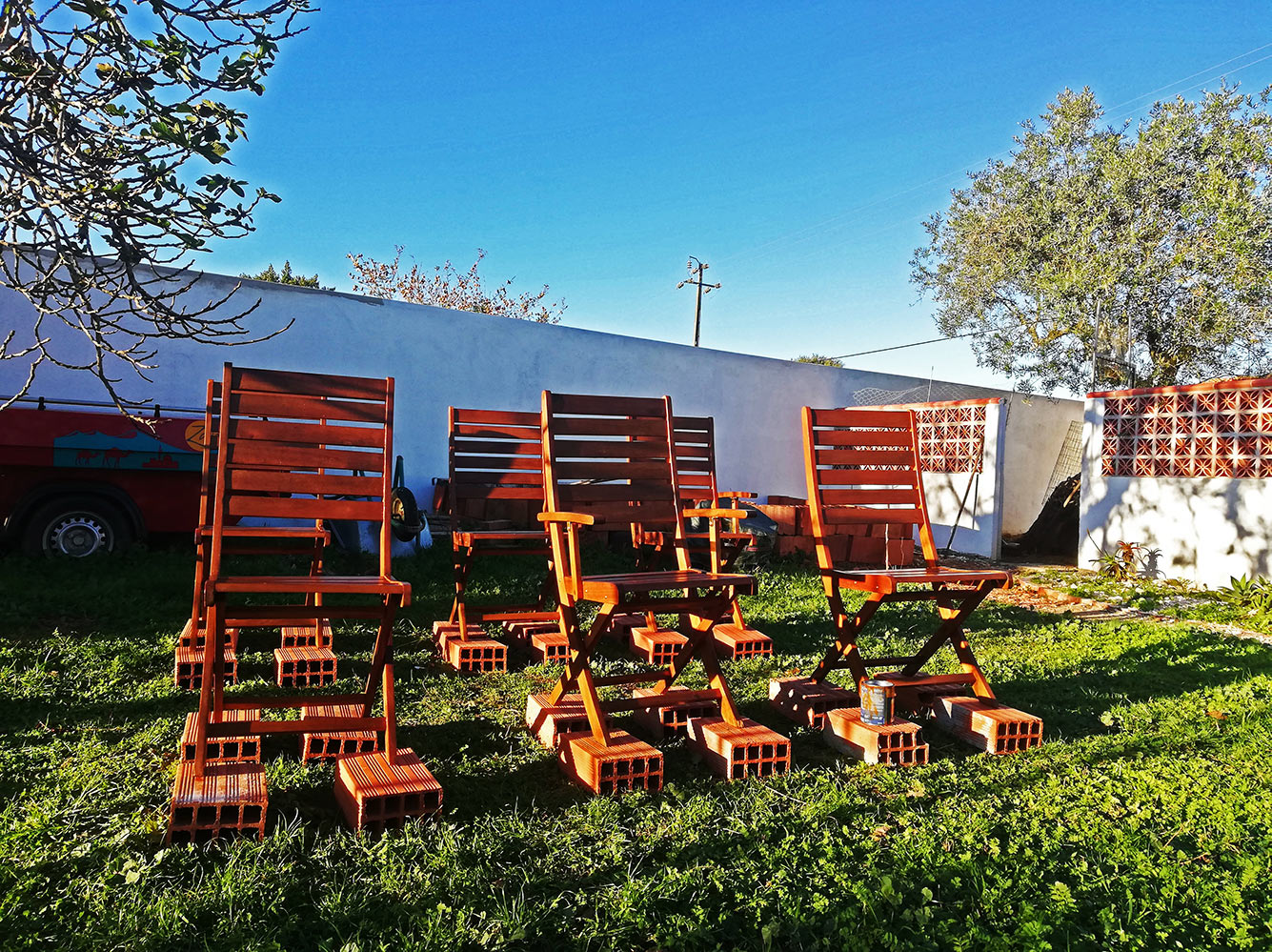 De terrasstoelen en -tafel hebben de hele zomer in de zon en de regen gestaan. Ook al stonden ze vaak onder het afdak, ze hebben toch wel te lijden gehad. Het zijn dan wel buitenstoelen en gemaakt van een soort hardhout, het neemt niet weg dat ze na een seizoen vaal worden en redelijk droog. Tijd daarom voor een opfrisbeurt en een nieuwe impregneringslaag. Het grasveld wordt omgetoverd tot een verfwerkplaats, de multifunctionele terracotta stenen houden de stoelen boven het gras.