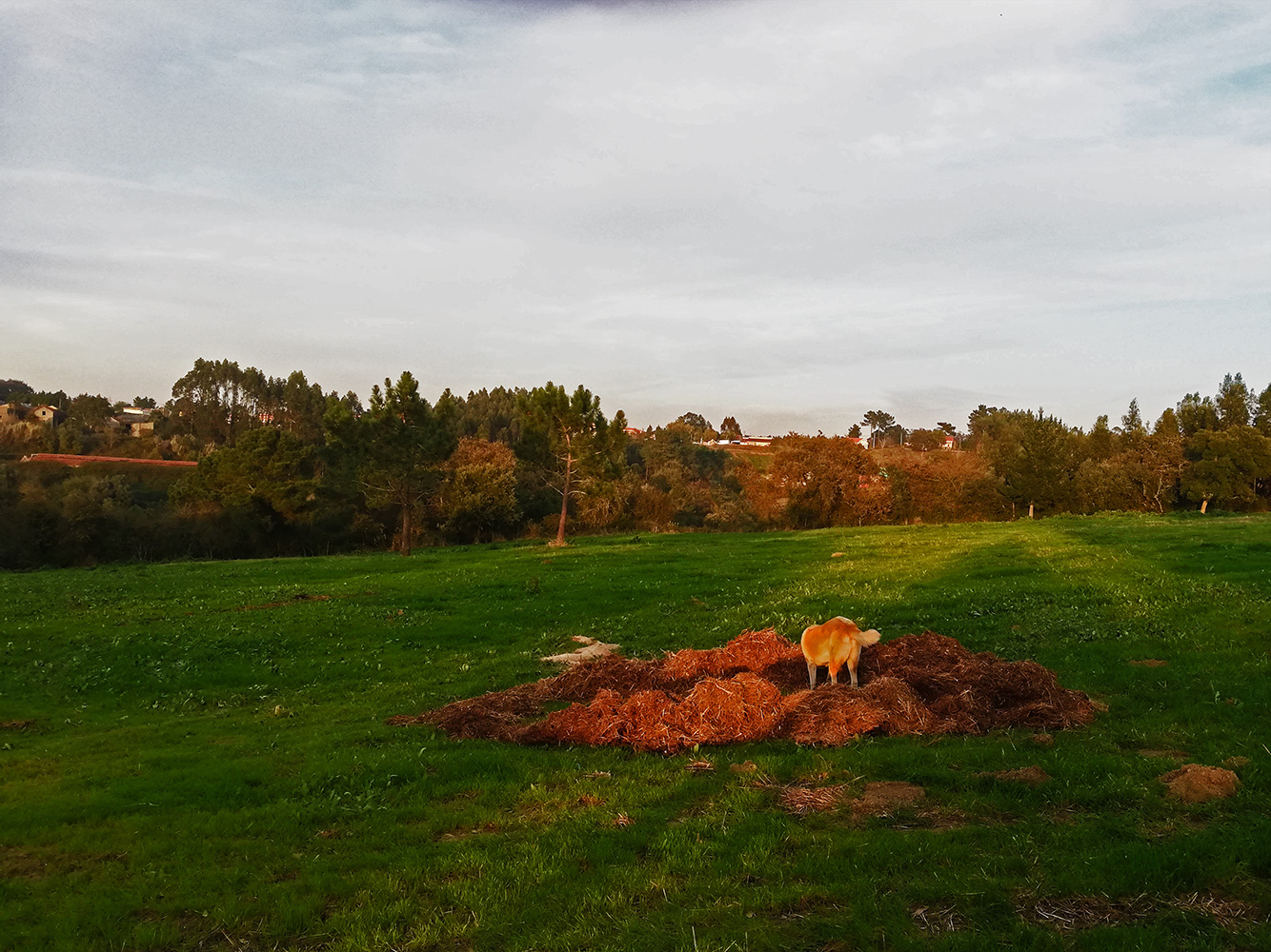 De mannen van Fonseca hebben hooi op het land gegooid, dat zal wel moeten drogen tot de paarden weer terugkomen. Op een afstand lijkt het op een grote molshoop, Karma is er helemaal van in de war. Ze weet niet of ze moet graven of moet vlaggen. Ze loopt er een beetje verdwaasd omheen. Er zitten natuurlijk allerlei geuren aan, van de paarden, van de stal, misschien van andere honden. Karma is er in ieder geval even lekker mee bezig.
