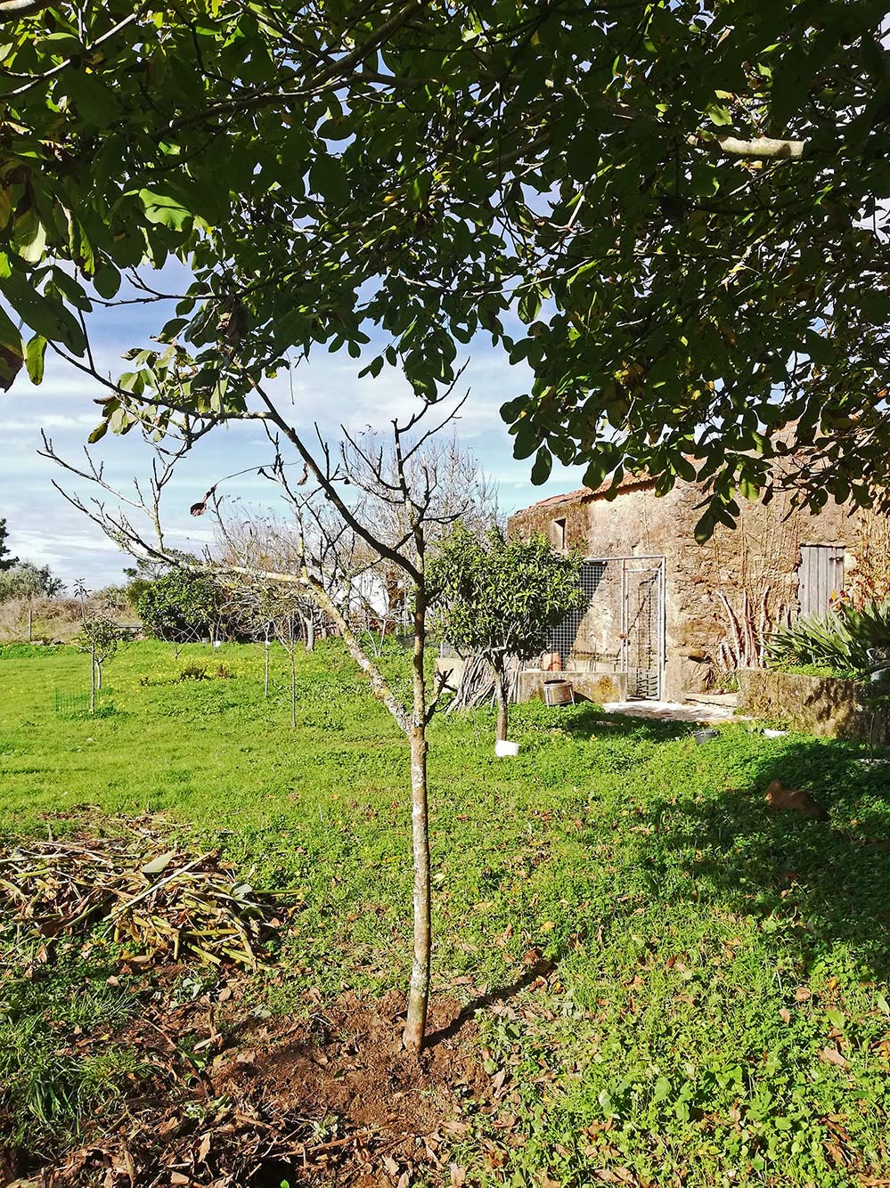 Samengevat: lastig voor ons om de deur uit te gaan en materiaal te kopen voor de volgende activiteiten, dus doen we nu dingen die we altijd al wilden doen, en waarvoor we geen materiaal nodig hebben: bijvoorbeeld de composthoop verplaatsen. De composthoop gaat naar het Hek van Miguel, dat het voor- en het achterterrein scheidt. Alleen, op die plek staan twee, wat miezerige notenbomen. De één is niks, die is lelijk van vorm en doet het nauwelijks, dus die hebben we gewoon omgezaagd. De andere geven we een nieuwe kans, voor het appartement in de buurt van de grote notenboom, met het idee dat als de grote notenboom het begeeft, het notenboompje alvast klaar staat om zijn plaats in te nemen.