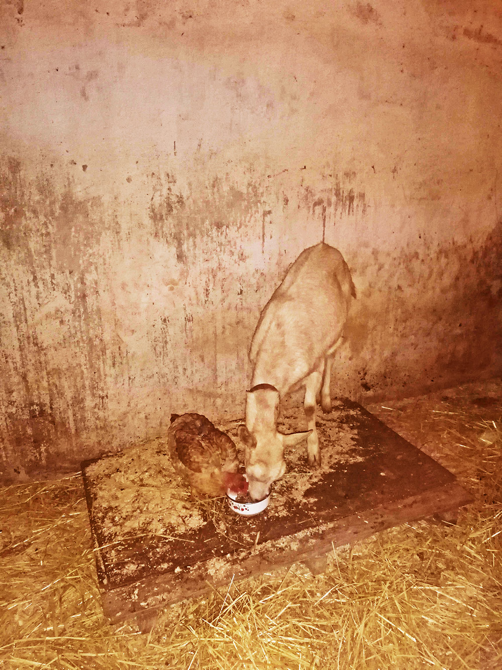 Próxima is nog steeds een beetje wereldvreemd. Ze komt niet graag de stal uit en blijft het liefst alleen achter. De andere twee kippen en de haan, Senhor Barcelos, gaan naar buiten en scharrelen een beetje rond. We hebben Karma een paar keer losgelaten op het gedeelte waar Isabela en de kippen lopen. Karma doet gelukkig niets, maar ze kan wel aan komen stormen en dat vinden de kippen toch wel eng. Ze blijven zich een beetje schuilhouden onder de bomen. Ze kunnen Karma wel zien, maar ze kunnen makkelijk wegkomen, dus dat vinden ze kennelijk een veilige plek. Próxima niet, die blijft binnen. Bang voor Karma, bang voor haar eigen vader. Het is een wat schichtiger dier. Je zou denken dat ze niet genoeg te eten krijg als ze zo binnen zit. Gelukkig maakt ze het ’s avonds goed. Als we Isabela aan het eind van de dag binnen zetten, krijgt ze altijd wat droogvoer en Próxima weet dat. Die wacht haar kans af en zodra het schaaltje voor Isabela is neergezet is ze er als de kippen (!) bij om wat van haar mee te pikken. In het begin joeg Isabela haar weg, maar ze zijn inmiddels vriendjes geworden en nu eten ze gewoon samen uit dezelfde bak. Bijna aandoenlijk om te zien.