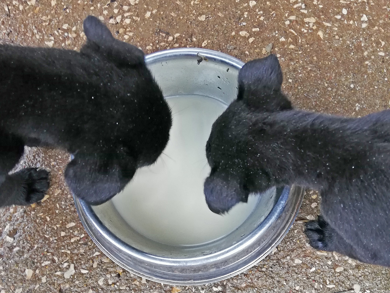 Het is heel verleidelijk om vanaf nu elke dag een fotootje te plaatsen en een klein verhaaltje over de jonge hondjes te schrijven. Er gebeurt altijd wel wat. Hoe ze slapen, hoe ze eten en hoe ze langzamerhand het terrein verkennen. Op deze foto hebben ze net hondenmelk gekregen, dat ze heel snel naar binnen werken, en waarschijnlijk door de warmte van de melk vallen ze ook heel snel in slaap. Ze liggen in elkaar gekruld in hun huisje dat we voor ze gemaakt hebben. Het huisje is eigenlijk een kattentransportmand, die omwikkeld is met plastic om de tocht weg te nemen.