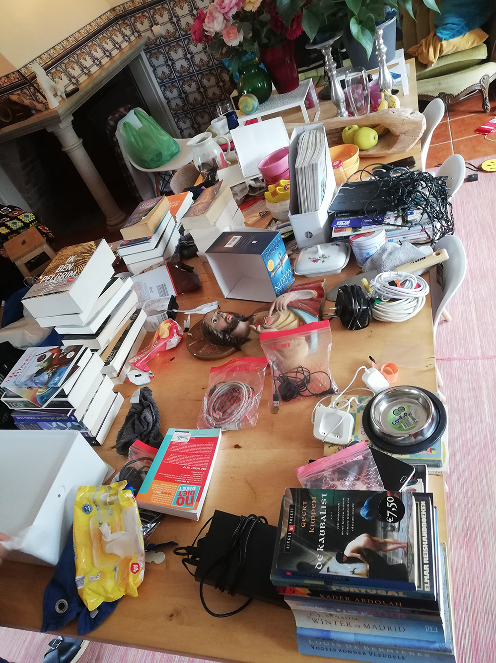 De koelkast zelf werd ook gebruikt als boekenkast. Er staan een paar stapels boeken bovenop en die moeten natuurlijk allemaal weg voordat hij verplaatst kan worden. Alles bij elkaar komt er flink wat tevoorschijn, dat dan ‘even’ ergens anders neergezet moet worden.