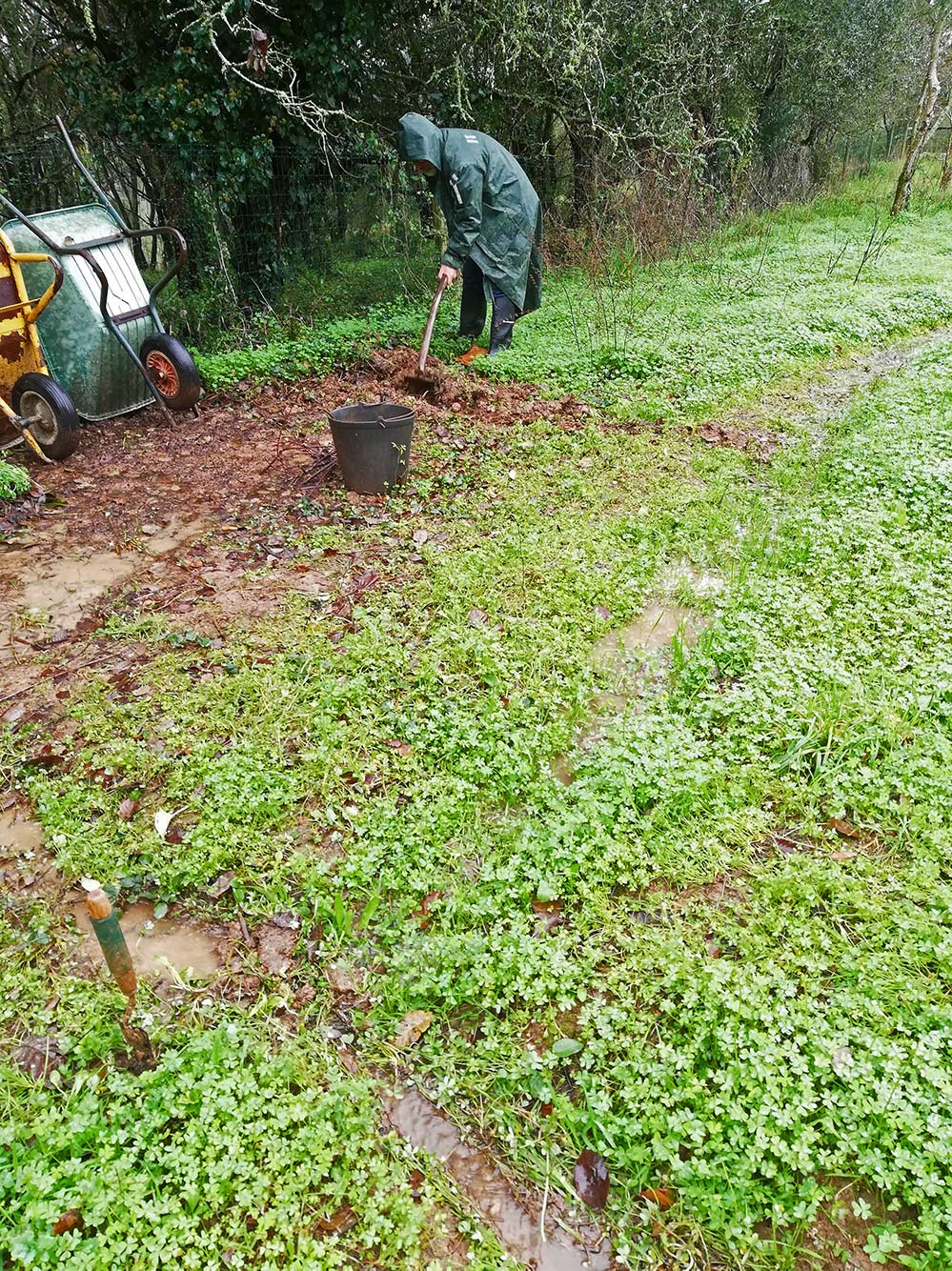 Het is hetzelfde liedje: het regent en het regent. Het mooie is wel dat af en toe de zon doorbreekt en dat het dan meteen aangenaam warm is. Maar er is zoveel water gevallen dat er overal op het land plassen beginnen te ontstaan. Bij het appartement staat een sinaasappelboom die in een kuil staat en in die kuil staat bijna vijftien centimeter water. Tijd om watermanagement toe te passen. Gelukkig is het land van de buren, het kurkeikenbos een heel stuk lager dan dat van ons, het scheelt wel dertig centimeter, en daarom kunnen we het zo regelen dat het water daar weg kan lopen. Dan moeten er wel wat geultjes gegraven worden. Van de sinaasappelboom loopt het af naar de nieuwe plek van de composthoop dus daar kunnen we gebruik van maken door een geultje richting de composthoop te maken, en dan een soort composthoop-bypass. Het zit ergens ook weer mee want de grond is erg zacht en er kan makkelijk gegraven worden. Het resultaat is een prachtig stromend beekje, eerst erg zanderig, maar al gauw helder.
