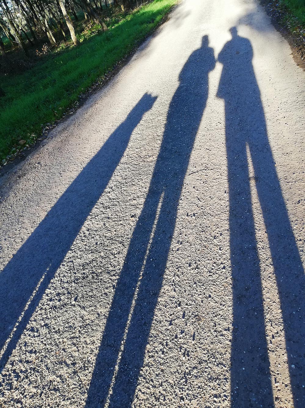 Doordat het ’s nachts een stuk kouder is hebben we ook geen mist meer en is de lucht al erg vroeg kraakhelder. Je kunt de zee dan wel niet zien, maar in de verte zie je wel iets dat wel eens São Martinho zou kunnen zijn. We nemen het altijd voor om thuis eens op de kaart te kijken, maar eenmaal thuis van het rondje zijn we dat natuurlijk weer vergeten. Doordat de lucht zo helder is, schijnt de zon meteen sterk, ook al is-tie nog maar net op en daardoor krijg je prachtige lange schaduwen. Als je de andere kant op loopt dan zie je niks met de zon recht in je gezicht.