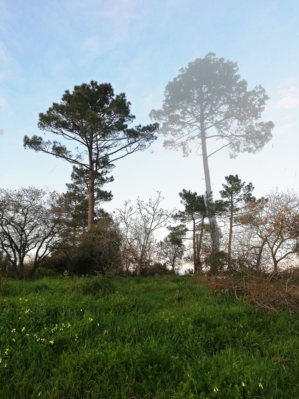 Heel jammer, langs het weggetje op het stuk tussen Rua de Lumião en Estrada do Lumião stonden twee enorm grote bomen. Een van beide is nu weg. Gekapt. Volgens de een omdat de boom dood was, volgens de ander omdat de eigenaar van het stuk grond hout nodig heeft. Wat de reden ook mag zijn, de boom is weg. Hoogstwaarschijnlijk zaten er eekhoorns in de boom, want we zagen zo af en toe afgekloven dennenappels onder de bomen liggen. Er zijn nog zat andere bomen waar ze heen zouden kunnen gaan, maar het blijft zonde. Op 15 mei 2019, dus ruim anderhalf jaar geleden, hebben we de bomen samen op de foto gezet en die foto gebruikt om de gekapte boom, als fantoomboom, hierin te plakken en te laten zien waar de boom stond en hoe dat er samen zo’n beetje uitzag.