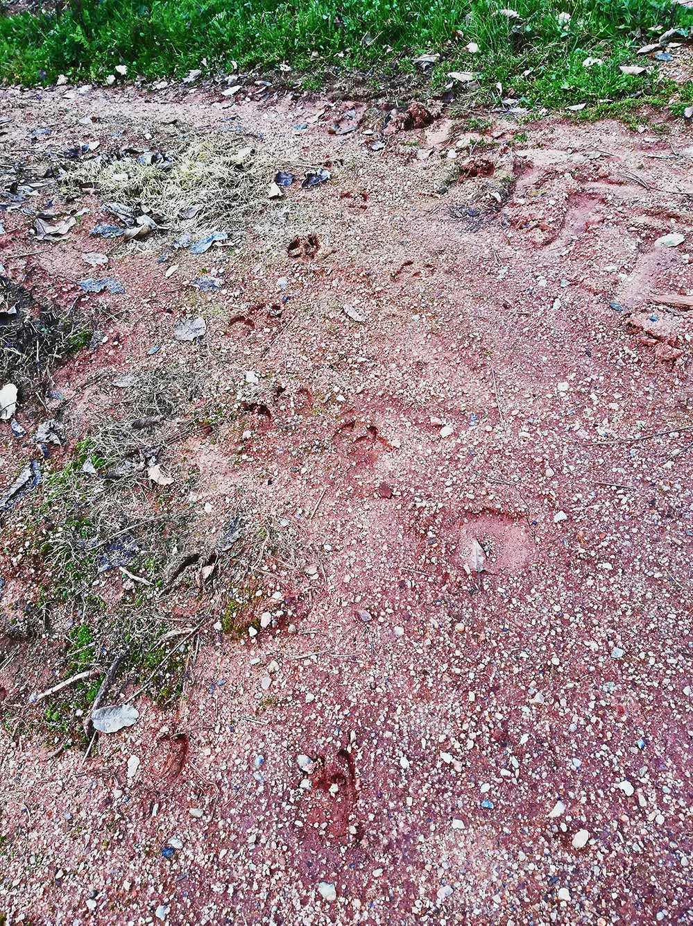 Gil ziet ze wel eens en Manuela heeft ze ook wel eens gezien. Wilde zwijnen die in de bossen zitten hier. Ze schijnen ’s ochtends vroeg tevoorschijn te komen. Wij zien alleen de sporen, zoals deze. Op het veldje langs het weggetje waar de appelbomen staan is een stuk waar geen gras groeit en waar de grond modderig is. Genoeg om sporen achter te laten. We zagen een paar van waarschijnlijk een vrij grote met wat kleinere. In het bos kun je stukken zien waar ze gelegen hebben en waar ze gewroet hebben. En je kunt heel goed paadjes zien, waar ze de berm in gaan naar een volgend stuk land. Karma is altijd erg geïnteresseerd als we langs zo’n paadje komen.