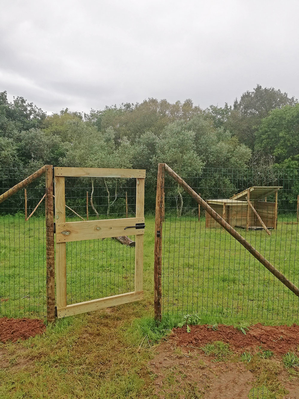 De kraal is af. Er moest nog een hekdeur komen en die is vandaag gemaakt. Alwéér hoofdbrekens, want de palen die de deurpost moeten vormen staan natuurlijk scheef en zijn krom. Maar het is gelukt. Een mooie houten deur bespannen met gaas, met drie scharnieren en een schuifslot. Op de achtergrond zie je de schuilhut, die bijna klaar is. Die hebben we vandaag ook afgemaakt. Morgen is de grote opening en kunnen de geiten eindelijk los in de wei. Waarschijnlijk gaan ze helemaal uit hun dak, want het is allang geleden dat ze losliepen. Ze staan nu altijd aan een pin en een touw. Wel steeds op een andere plaats, maar het is toch een soort van vrijheidsberoving. Alleen Inês, is altijd los, die blijft bij moeder en tante, dus daar hoeven we ons niet zo druk om te maken, maar het zou wel een keer gaan stoppen, we zijn dat mooi voor met de nieuwe kraal.