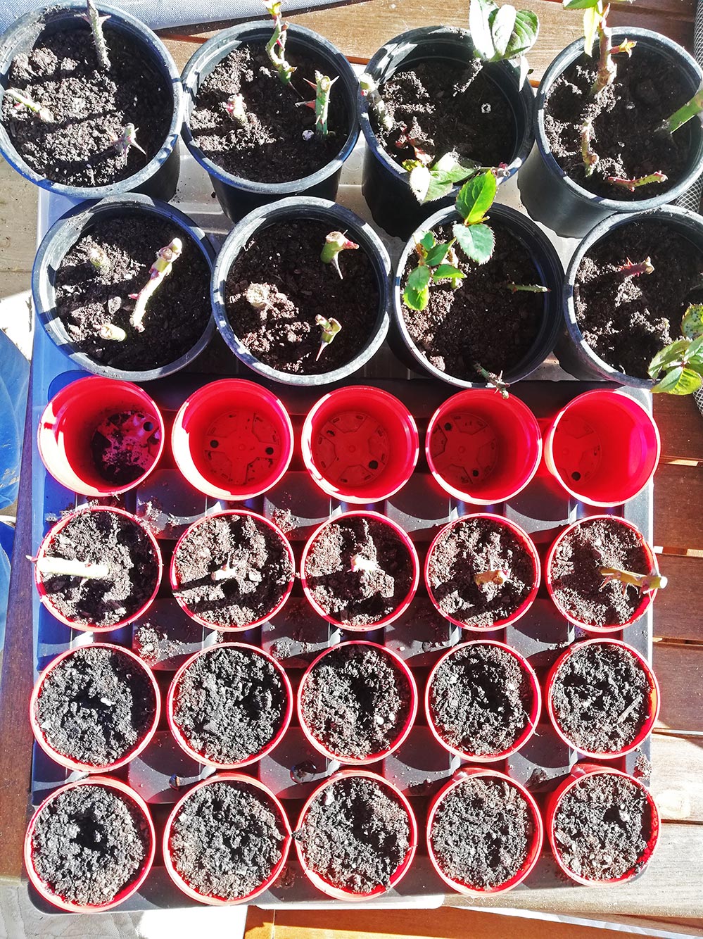 Wandelen met de hond mag dus ook, we komen vaak Avelino tegen met wie we dan op gepaste afstand praten. Hij had pas zijn rozenstruik helemaal gesnoeid en hij gaf ons de takken, die we dan als stekken kunnen gebruiken. Hij gaf er zo instructies bij, hoe je precies moet afsnijden en in welke aarde ze moeten en ook nog hoe vaak ze water moeten hebben. Als alles aanslaat kunnen we een prachtige rozenhaag maken, maar eerst maar eens kijken of ze het gaan doen. Ze staan nu in potjes op een mooi plekje, niet te veel zon, in verse potaarde, dus dat moet wel goed gaan. Ze moeten wel beschut staan, want het vriest nog steeds een beetje ’s nachts. Al twaalf nachten op rij hebben we nachtvorst.