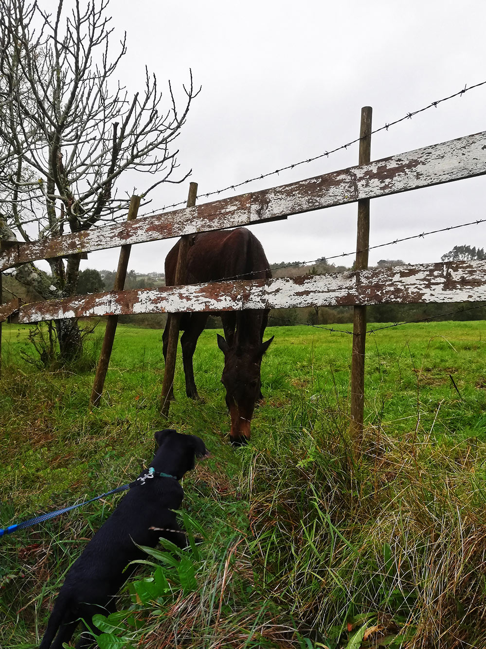 We doen niet zo veel nu het regent. Het miezert zo’n beetje de hele dag met af en toe een flinke bui, op bezoek gaan we natuurlijk ook niet. In Portugal gaat het nog lang niet de goede kant op, meer dan 15.000 nieuwe gevallen vandaag. We zetten wel een kast in elkaar, want dat is binnen, en veel achterstallige administratie en ook naaiwerk. Daar komen we nu tenminste aan toe. Wat we natuurlijk wel elke dag doen is het rondje met Karma, Tomás en Milan. Er is altijd wel wat. Tomás is begonnen kennis te maken met de paarden. Die zijn gelukkig helemaal niet bang voor de puppy’s en dat is wederzijds. Wel voorzichtig. Er wordt gesnuffeld en geroken en af en toe geschrokken, maar het gaat er allemaal redelijk rustig aan toe.