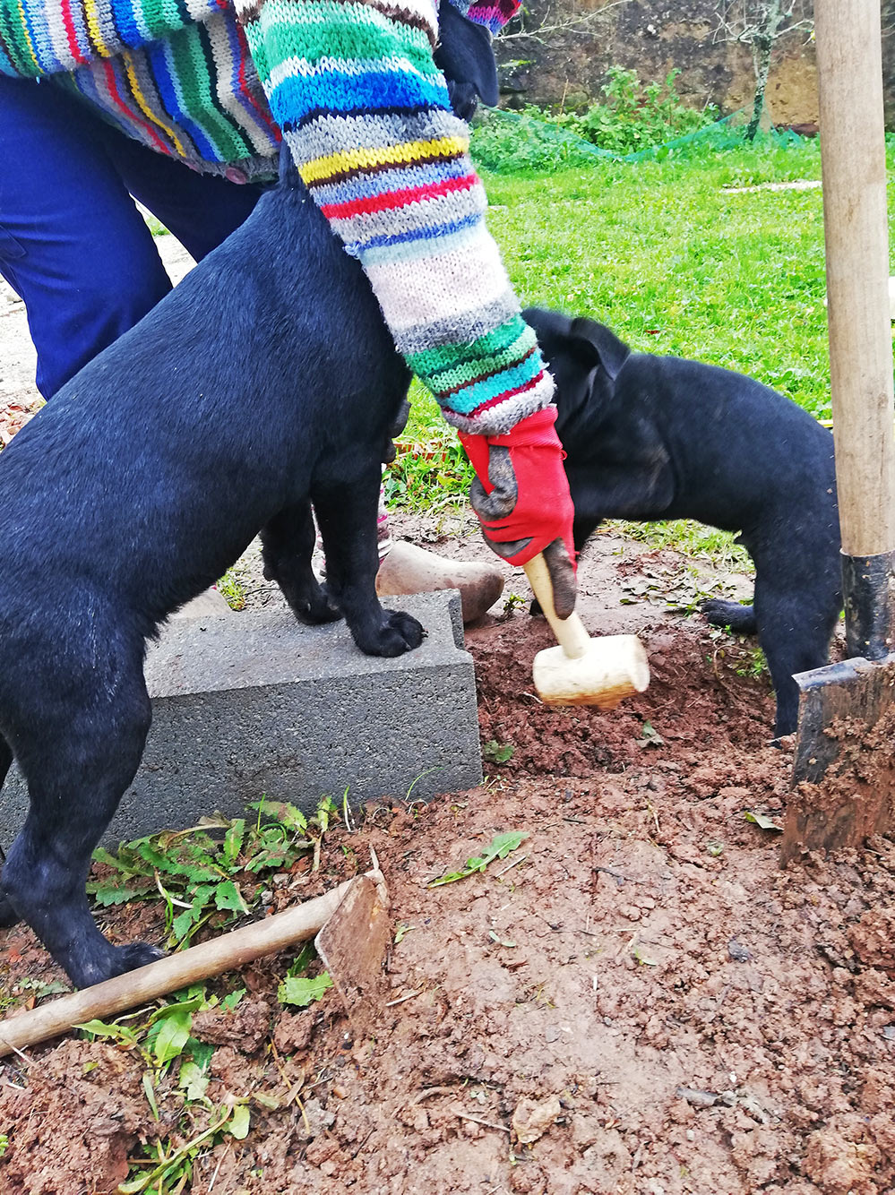 We zijn begonnen met een soort van fundering te maken van betonstenen waar dat het hek op moet komen. Milan en Tomás komen daar erg graag bij helpen, ze vinden vooral het vangen van de hamer waarmee de stenen op hun plaatst getikt worden een prima tijdverdrijf. ’t Schiet lekker op zo.
