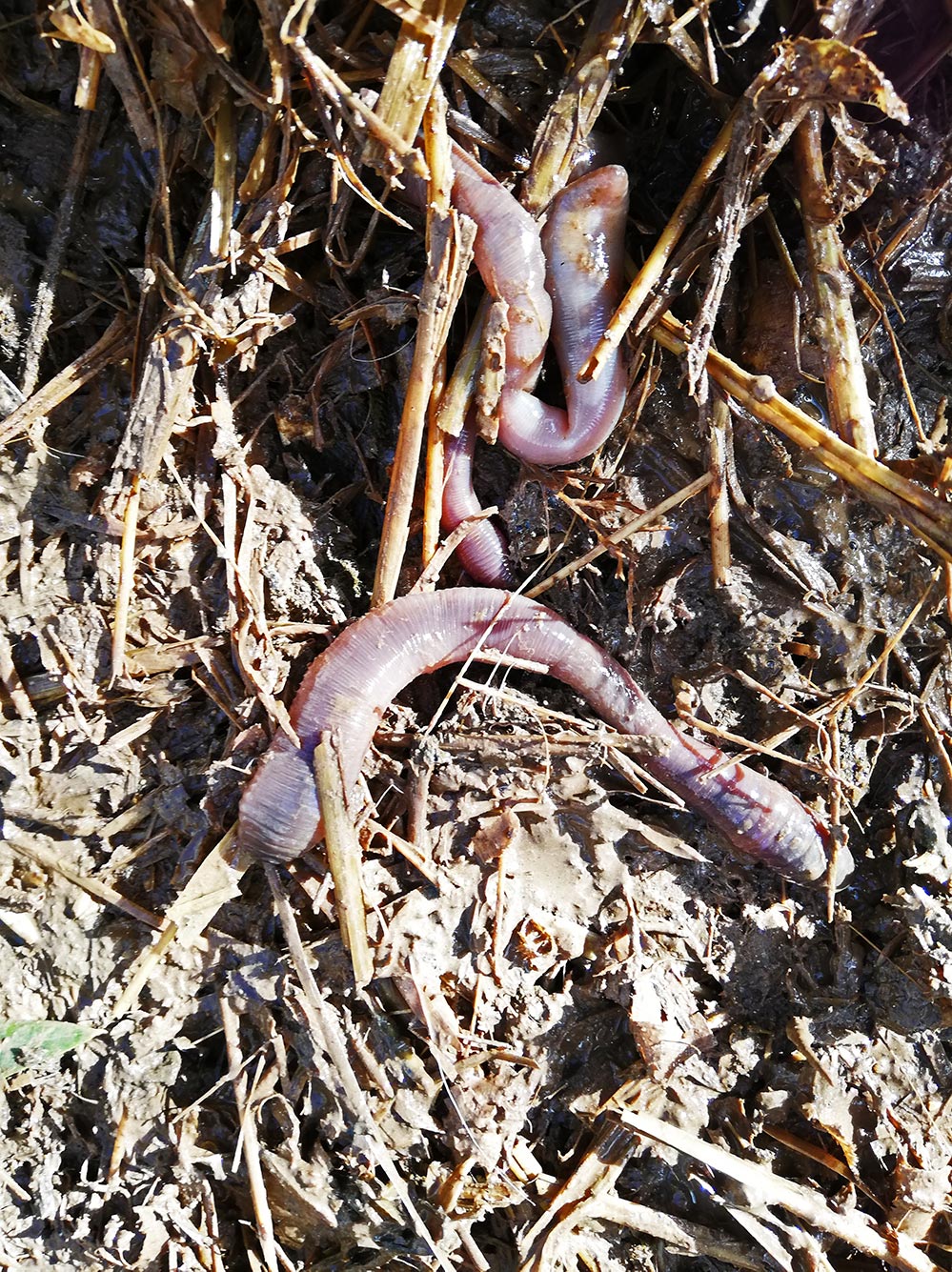 Op het stukje voor het kippen- en geitenhok, leggen we het hooi en stro dat uit de stal komt, dan kan het even uitwasemen en de kippen kunnen dan nog van alles erin vinden. Na een weekje scheppen we het dan op de composthoop. Doordat het nogal geregend heeft is het hooi-en-stromengsel door- en doornat. De grond eronder is verzadigd, het is een soort vette klei. ’t Water blijft er niet op staan, maar de bovenste laag is een donkerbruine brei. Op de grens tussen stro en grond is het een pierenparadijs. Het stro vermengt zich met de bovenlaag van de grond en daar huizen de wormen. Soms als je een stukje wegschuift, zie je er zo twintig in elkaar gekronkeld zitten. Lastig om te fotograferen want ze schieten snel de grond in. Het maakt het wegscheppen wel lastig, tenminste als je het aantal pierenslachtoffers zo laag mogelijk wil houden. We houden het op de grote Pierenverhuizing want we proberen zoveel mogelijk te verzamelen en weer los te laten op de composthoop, waar ze verder hun werk kunnen doen. Of dat uiteindelijk werkt moeten we maar bezien, misschien dat ze allemaal naar beneden vluchten en hun heil verder in de bosgrond zoeken. Maar we hebben ons best gedaan.