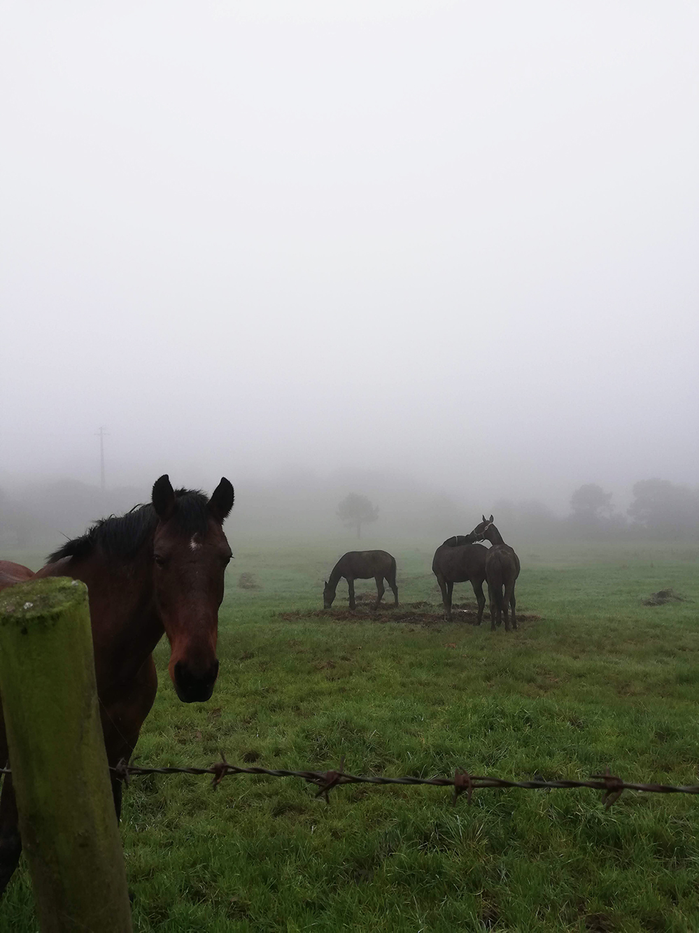 De ene dag regent het, of het miezert een beetje, de andere dag schijnt de zon volop, maar de dag begint de laatste tijd steevast met mist. De mist blijft een beetje hangen in het dal en als het dan bijna niet waait krijg je een beetje mysterieus sfeertje. De kudde paarden is gegroeid tot een stuk of zeven waarvan een paar mooie veulens. Als ze rondrennen geeft het een vreemd klaterend geluid, want het veld is zo nat, dat het water opspat als ze galopperen. Erg grappig als je ze niet kan zien, mar wel kan horen.