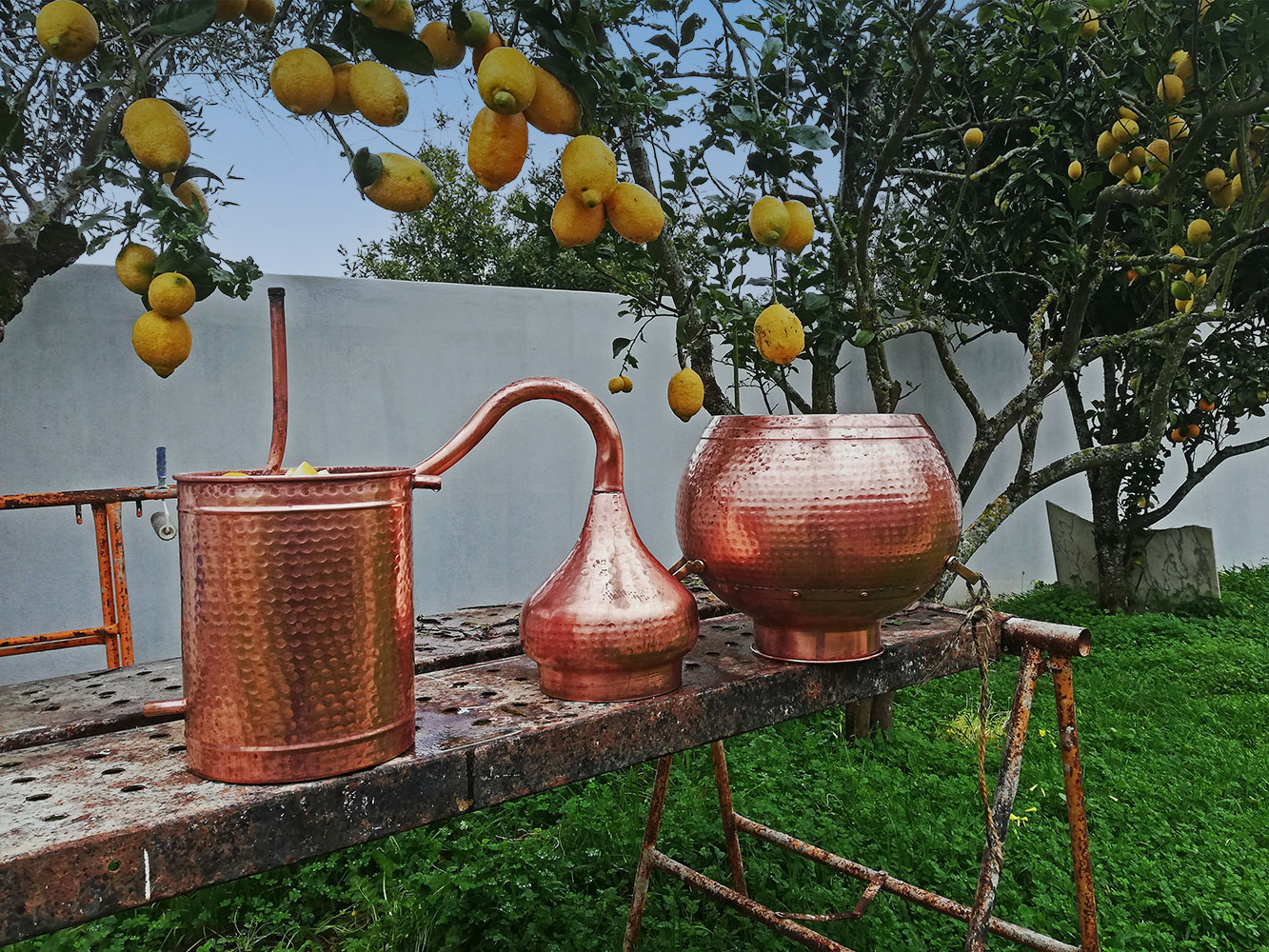 Vorig jaar zaten we plotseling vast in Nederland. Nou ja vast, dat valt ook wel weer mee, maar de geplande tien dagen werden zomaar drie maanden. De destilleerketel heeft al die tijd geen dienstgedaan. Er staat nog wat te gisten sinds die tijd. ’t Zou zo’n veertien dagen moeten staan, maar het staat nu al elf maanden. De emmer is luchtdicht (met een waterslot) en bij het verplaatsen ontsnapte een klein beetje lucht. Dat rook best goed, dus misschien kan het nog goed gedestilleerd worden. De ketel is al die tijd niet aangeraakt, dus een beetje vies en dof was-tie wel geworden. Schoonmaken dus. Een probaat middel is citroenzuur vertelt een korte rondgang op internet. Citroenen hebben we genoeg, dus aan citroenzuur is wel te komen. Even wat persen en we hebben zo genoeg. De buitenkant wordt gepoetst en een beetje geschuurd met jif en de binnenkant met citroenzuur. Het ziet er weer glanzend uit.