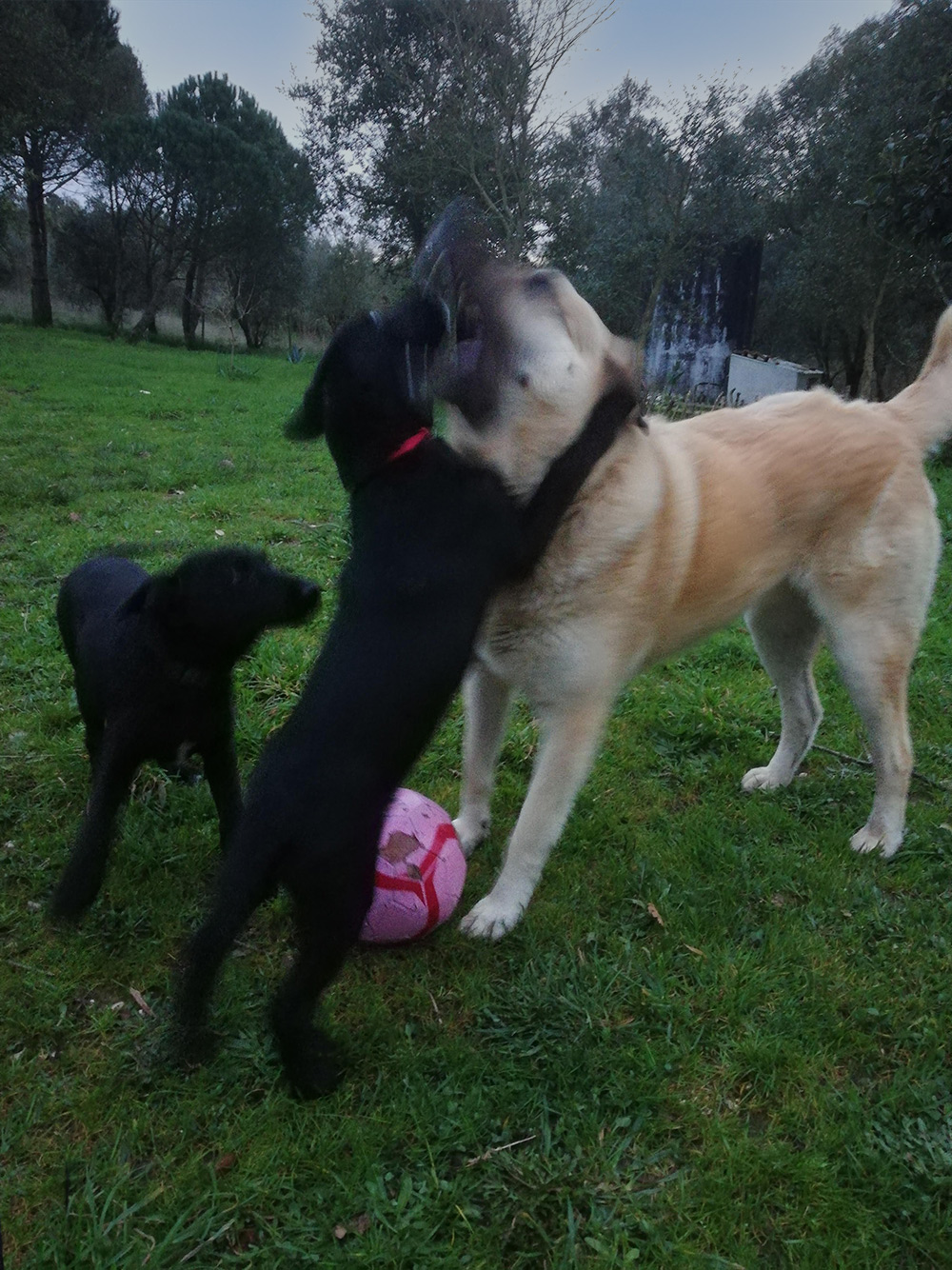 Speelkwartier. Alweer. Het blijft nou eenmaal leuk om naar te kijken, dus zo af en toe maar weer een fotootje van de honden. Karma is nu wel gewend aan Tomás en Milan en ze daagt ze nu ook uit om te gaan spelen. De jonge honden drentelen er niet meer achteraan, er wordt nu serieus gerend en echt bang voor Karma zijn ze echt niet meer. Alleen als ze iets te ver gaan en Karma gromt, dan rennen ze toch wel gauw weg om ergens onder een stoel te gaan liggen. Een paar seconden maar, want ze zijn het alweer snel vergeten en rennen weer enthousiast op Karma af.