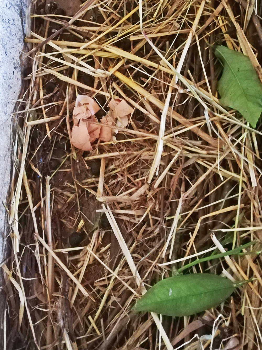 Hoe het nou precies zit weten we niet. Próxima heeft de gewoonte in de ruif voor de geiten een soort van legnest te maken. Meestal legt ze haar ei gewoon op het nest, maar soms vindt ze de ruif prettiger. De ruif was leeg en het ei lag kapot op de grond. En dan is de vraag: heeft Próxima haar ei gelegd terwijl de ruif leeg was en liet ze haar ei daar gaan, of heeft ze haar ei gelegd toen de ruif nog vol was en hebben de geiten het onder haar leeg gegeten? Hoe dan ook, het ei is kapot er ligt alleen nog wat schil, de struif is weg, dat hebben de kippen gegeten of misschien wel de geiten. Zo schiet het niet op met de eierverzameling. We zouden drie eieren per dag moeten hebben, maar het lijkt of Próxima de enige is die legt op het moment.
