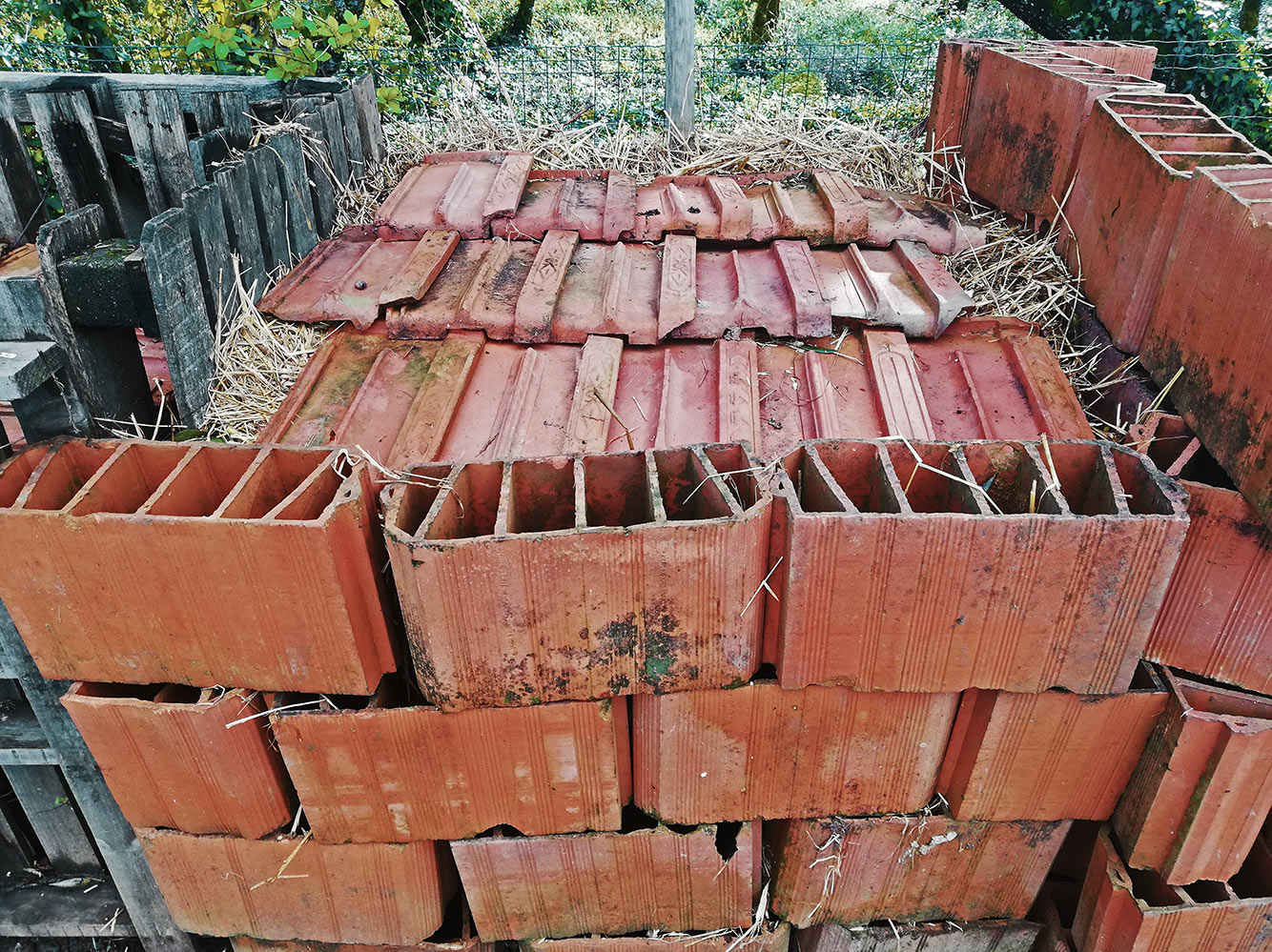 Een composthoop blijft fascineren. We hebben een flinke stapel gemaakt van hooi, stro en groen afval van het terrein als we gemaaid hebben. We hebben dat netjes gestort tussen terracotta stenen en toen-ie helemaal vol was hebben we er dakpannen opgelegd. Het idee is dat het gewicht van de pannen de boel een beetje in elkaar drukt en het houdt ook natuurlijk de groei van onkruid tegen. Het is grappig om te zien dat binnen anderhalve week het al voor meer dan 20 cm is ingezakt. De hoop ernaast die nu anderhalve maand staat te rusten is al meer dan een halve meter ingezakt.