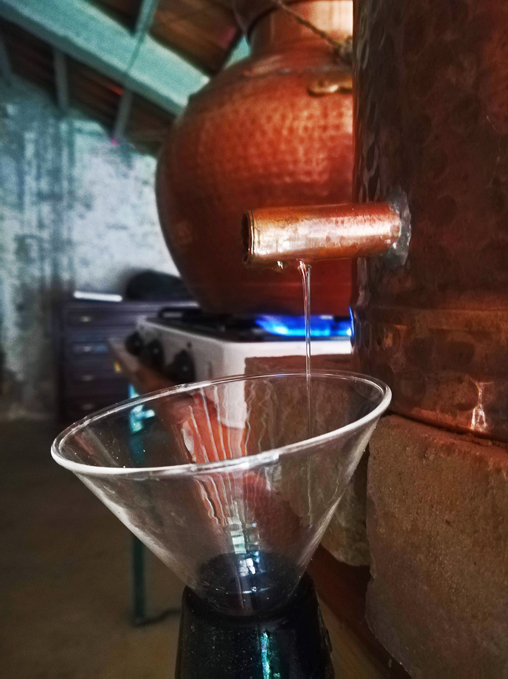 Bijna een jaar geleden, voor we naar Nederland gingen en we daar moesten blijven vanwege het vliegverbod door Corona, hadden we vijgen op gist gezet. Het was de bedoeling dat het een week of twee zou staan en dat het erna gedestilleerd zou worden. Twee weken werden twee maanden, twee maanden werden er drie, en al die tijd stond het spul daar. Wel netjes afgesloten in een gistvat met waterslot. Toen kwam het leeghalen van het oude huis, toen kwamen er weer zoveel andere dingen tussendoor dat het een beetje vergeten werd. Nu het weer even wat minder is komt het mooi om eens te kijken wat ervan te maken valt. Het spul in het vat ruikt erg goed. Echt als sterke drank, en geen stank. De vloeistof ziet er ook helder uit, wel met een dikke laag droesem op de bodem. Dus destilleren maar.