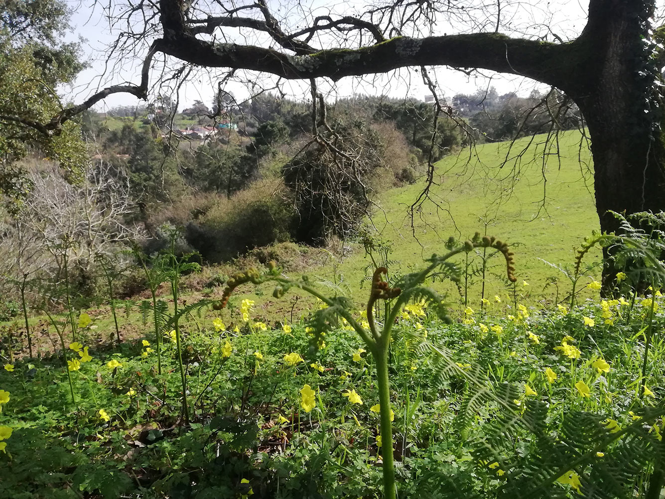 Aan het eind van dat stukje grond staat een monumental Portugese eik. Misschien ook wel op het punt van omvallen, want hij staat gevaarlijk dicht bij de rand en op dat punt gaat het bijna loodrecht naar beneden. Ernaast staat een vijgenboom, die blauwe vijgen geeft. Eigenlijk weten we niet of die van ons is, want waar nou precies de grens loopt met de buren weten we eigenlijk niet, maar we doen alsof. Aan het eind van vorige zomer hebben we al het onkruid en de bramen en wilde rozen die onder en door de vijg groeiden weggehaald, en nu komen daar de varens op. Dat doen ze heel grappig. Eerst groeit er een steel uit de grond met aan het eind een bolletje. Dat bolletje opent zich en er vouwen zich een baar bladen uit. Die moeten dan weer uitgroeien tot volledige varensbladen. Mooi om te zien hoor.