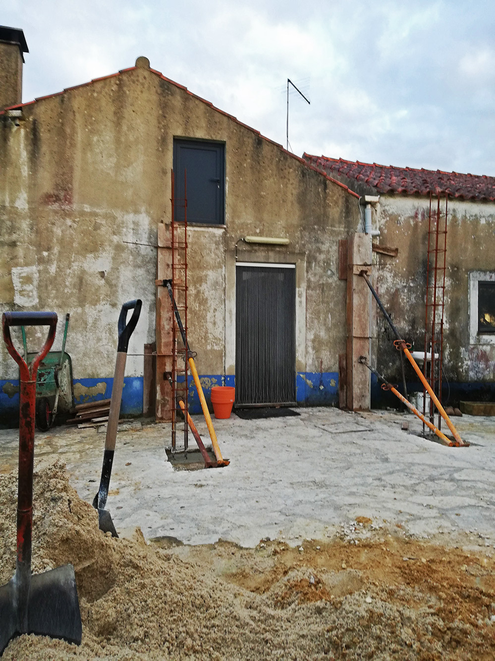 Half oktober zijn Ilídio en Joaquim geweest om een begin te maken met het afdakje boven de deur. Twee grote gaten werden er in de grond gemaakt, gevuld met cement en daarin betonijzer voor de kolommen die er moeten komen. Ondermeer door de hevige regen die er is gevallen konden ze lange tijd niet verder gaan, Maar nu is de dag dat ze weer aan de slag gaan. De twee gaten zaten iets te ver van het huis naar onze zin, dus werden er twee nieuwe gemaakt. Natuurlijk met complicaties! Bij het graven van het ene gat stuitte Ilídio op een gasleiding. Hij heeft hem geraakt, maar hij is niet lek, gelukkig. Nu wilden we toch van het gas af dus het is een aanstaande loze leiding. De gasfles is  is al afgekoppeld, het enige apparaat op gas dat we nog gebruiken is de geiser en die heeft een tijdje geleden al de geest gegeven. We douchen nu in het appartement op een elektrische boiler.