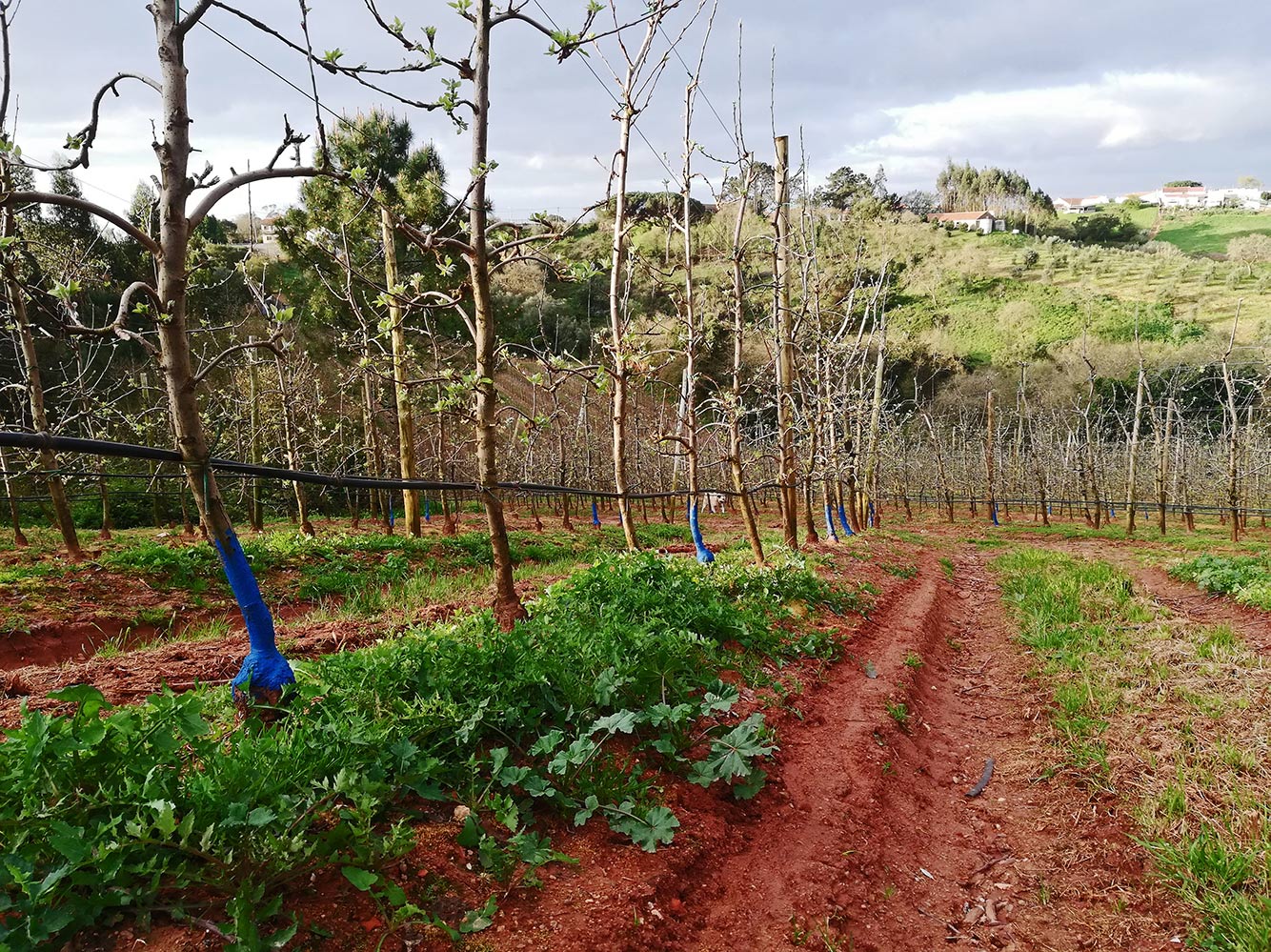 De appelboomgaard langs het weggetje is weer helemaal bijgewerkt. De bomen zijn gesnoeid, het meeste onkruid is weggehaald. De sproei-installatie is nagekeken. Het gebeurt allemaal buiten beeld, maar we lopen twee keer per dag langs en dan zie je wat er veranderd is. Sommige stammen zijn zo’n dertig centimeter aan de onderkant blauw gekleurd. Lang niet allemaal, en ook zonder enige regelmaat. De geverfde bomen zien er niet ziekig uit of zo, dus we snappen niet helemaal waarvoor dat is. Als we eens iemand zien rondlopen kunnen we het vragen, maar je ziet bijna nooit iemand. Pas als de appels geplukt gaan worden, maar dat duurt nog wel even en met een beetje pech is de blauwe kleur dan weer weg.