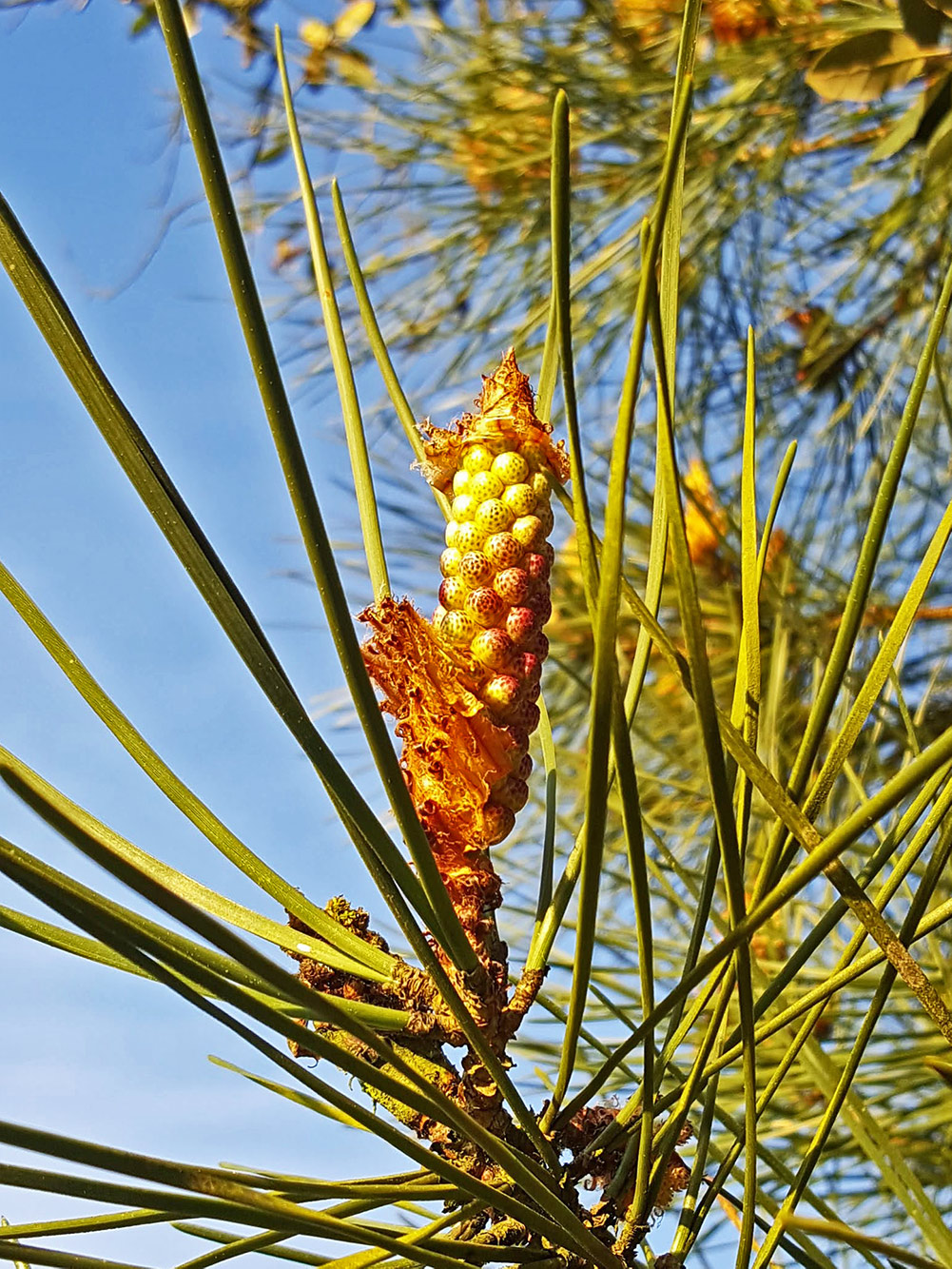 Mooi hoor, nooit eerder gezien. Zijn die bolletjes waar de pijnboompitten in zitten? Of is dit alleen nog maar de bloem?