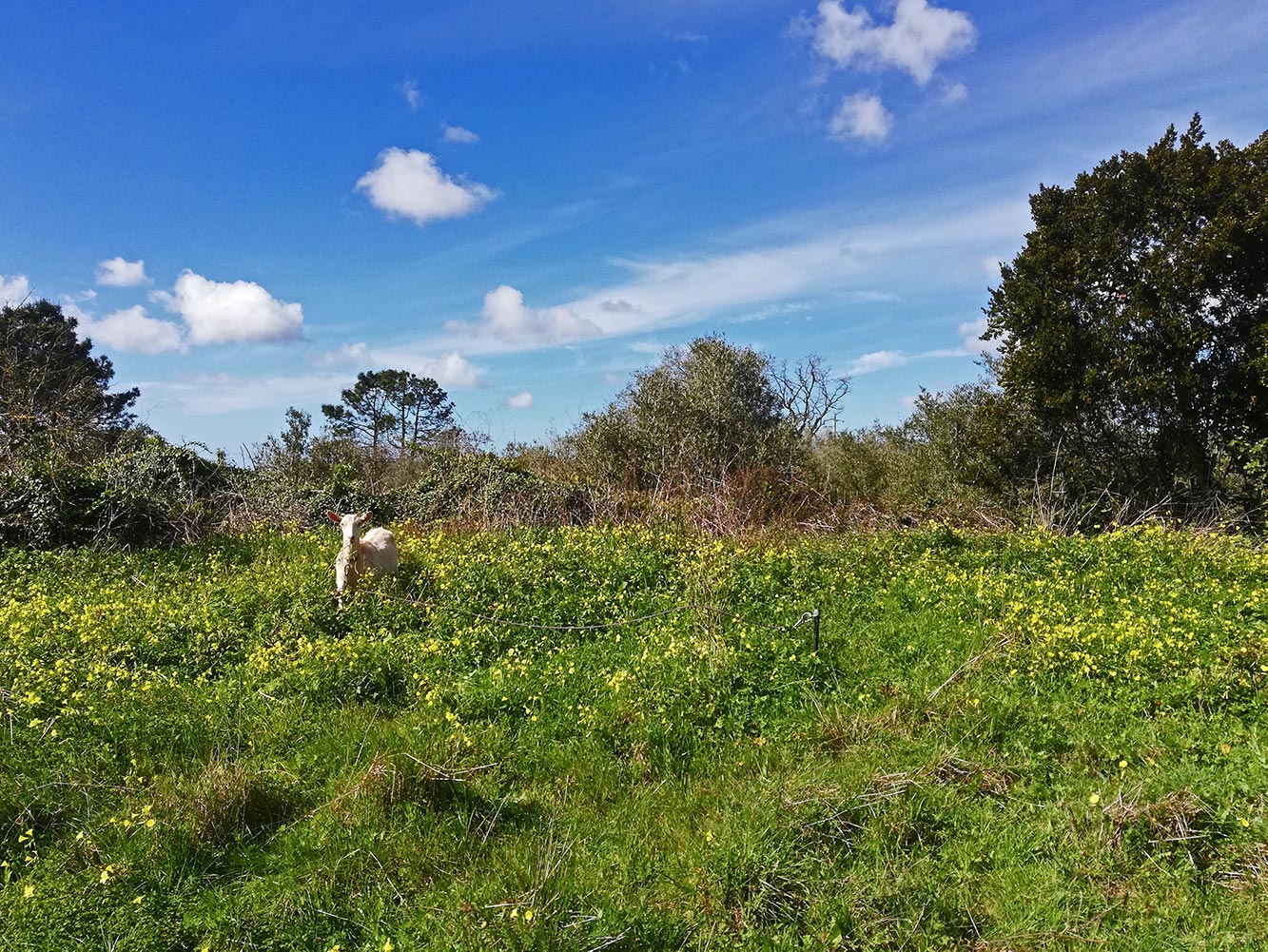 Beatrice en Isabel staan lang niet altijd bij ons op het land. Af en toe moet het gras weer even de tijd krijgen om te groeien. We zetten ze vaak aan de overkant neer tussen de fruitbomen en olijven, maar daar kunnen ze niet aan een zo lang touw omdat ze niet bij de bomen mogen komen. Ze eten de bast ervan af. Vaak zetten we ze bij de buren op het land. Dat stuk land is een boomgaard, maar zeker de helft heeft geen bomen. Het staat vol met beginnende bramen, klaver en ander laag spul. De buren komen misschien één keer per jaar om alles weg te maaien. Ondertussen laten wij de geiten er grazen. Isabel kun je zien, maar Beatrice verdwijnt een beetje tussen het hoge gras.