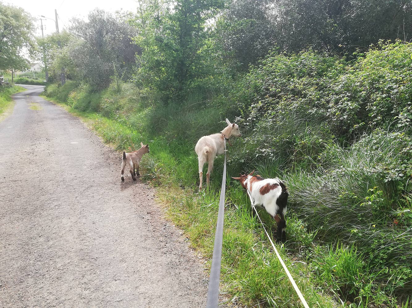 De drie geiten staan normaal gesproken op het terrein en om ze af en toe wat variatie te geven staan ze ook wel eens op het terrein van de buren, waar het voor de geiten een soort snoepwinkel is. Alleen, ze moeten wel vast en met Inês in de buurt is dat lastig, of we moeten er de hele tijd bij zijn. Inês zit nog niet vast, die huppelt vrolijk rond en kan gaan en staan waar ze wil. Ze blijft natuurlijk in de buurt van haar moeder Beatriz, ze mag los omdat ze niet meteen van de fruitbomen begint te knabbelen. Isabela en Beatriz doen dat wel zodra ze de kans krijgen.
