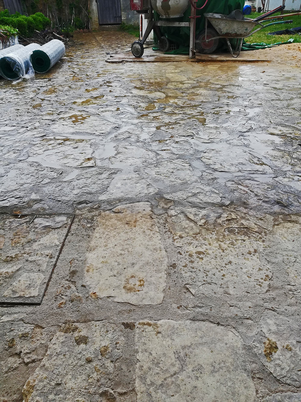 De afgelopen dagen is het steeds fantastisch weer geweest zonder een spatje regen. Jammer bijna, want we konden niet zien of het afdakje boven de deur dat Ilídio en Joaquim hebben gemaakt wel werkte. De trap naar boven werkt, we kunnen naar boven én weer naar beneden. Het afdakje werkt ook in de zin dat we nu laarzen, klompen, vuile schoenen en zo buiten kunnen laten staan ook als het flink regent. We werden in de loop van de middag getrakteerd op een enorme hoosbui van een paar centimeter in misschien een uur tijd. De spullen staan droog onder het afdakje, al sijpelt er wel wat water langs de muur. Hopelijk wordt dat opgelost als de definitieve laag erop komt en als het gestukt is. Het jammere van de regen is wel dat Joaquim en Ilídio niet verder konden en dat we moeten wachten tot na Pasen, want morgen is Goede Vrijdag en dan wordt er niet gewerkt in Portugal. Hooguit de supermarkten zijn open want die zijn altijd open,