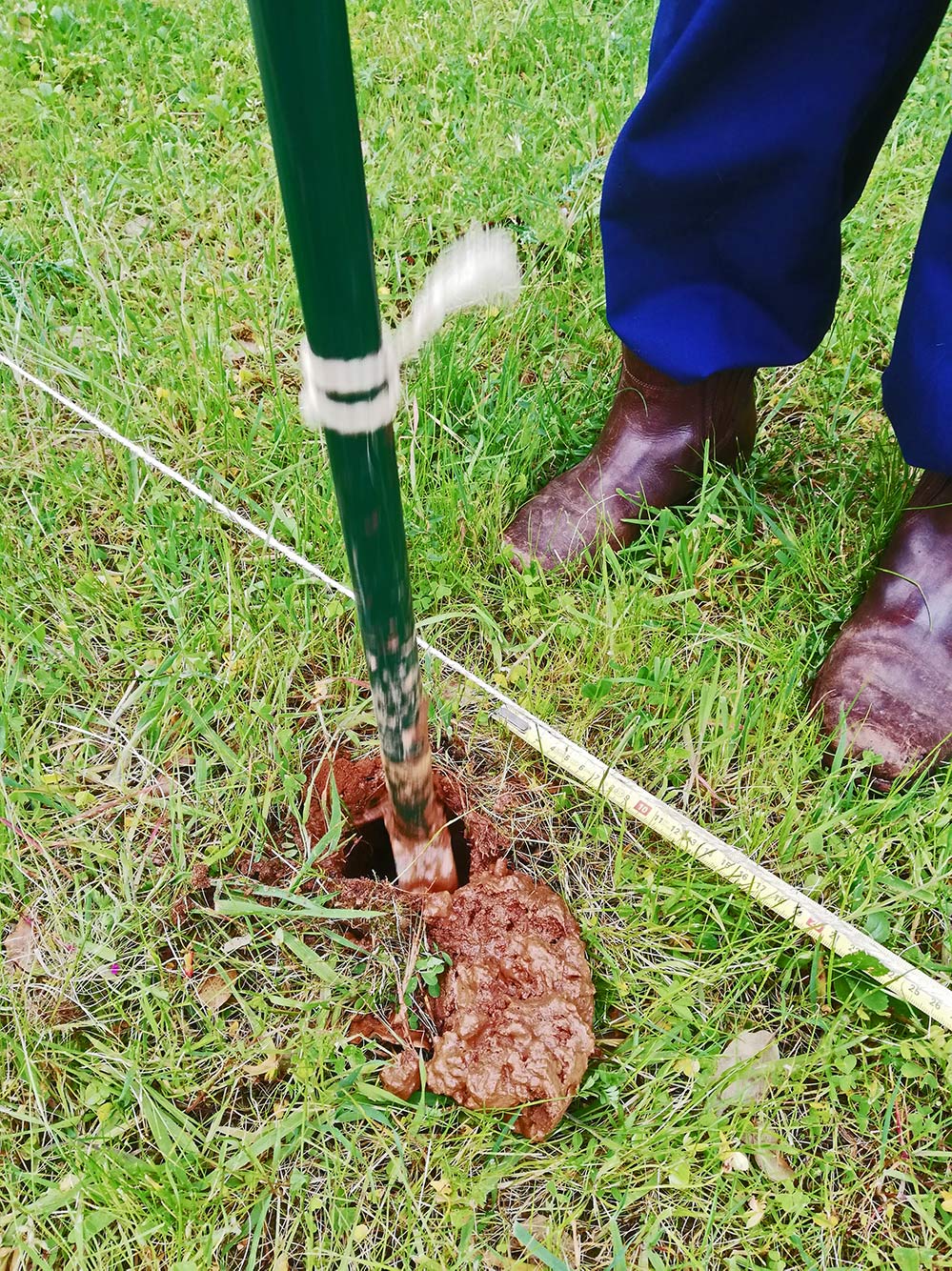 Eerst maar de palen. In Nederland hebben we ruim twintig jaar geleden een schutting gezet, en daarvoor hadden we een grondboor nodig. Het ding is al die tijd niet meer gebruikt, maar met een soort van vooruitziende blik hebben we die meegenomen naar Portugal. Nu komt-ie dus heel goed van pas. De grond is precies goed. Niet te droog, dat het meteen weer dicht loopt, en niet te nat dat er geen gat in te maken valt. Af en toe moeten we er wat water bij doen om een wat stevige klei uit de grond te kunnen trekken. Met elke paal zijn we een kleine tien minuten bezig, uitzetten, boren, paal erin, rechtzetten en het gat weer dichtkleien zodat de paal stevig en recht staat. Vandaag schijnt er geen zon, en het regent ook niet. Ideale omstandigheden. Als het allemaal staat geven we er met een bate-estacas een paar flinke klappen op, zodat ook de bovenkanten redelijk in een rechte lijn komen te staan. Het hekwerk zal nog wel een gevecht worden om dat goed erop te krijgen, maar we gaan het vanzelf zien.