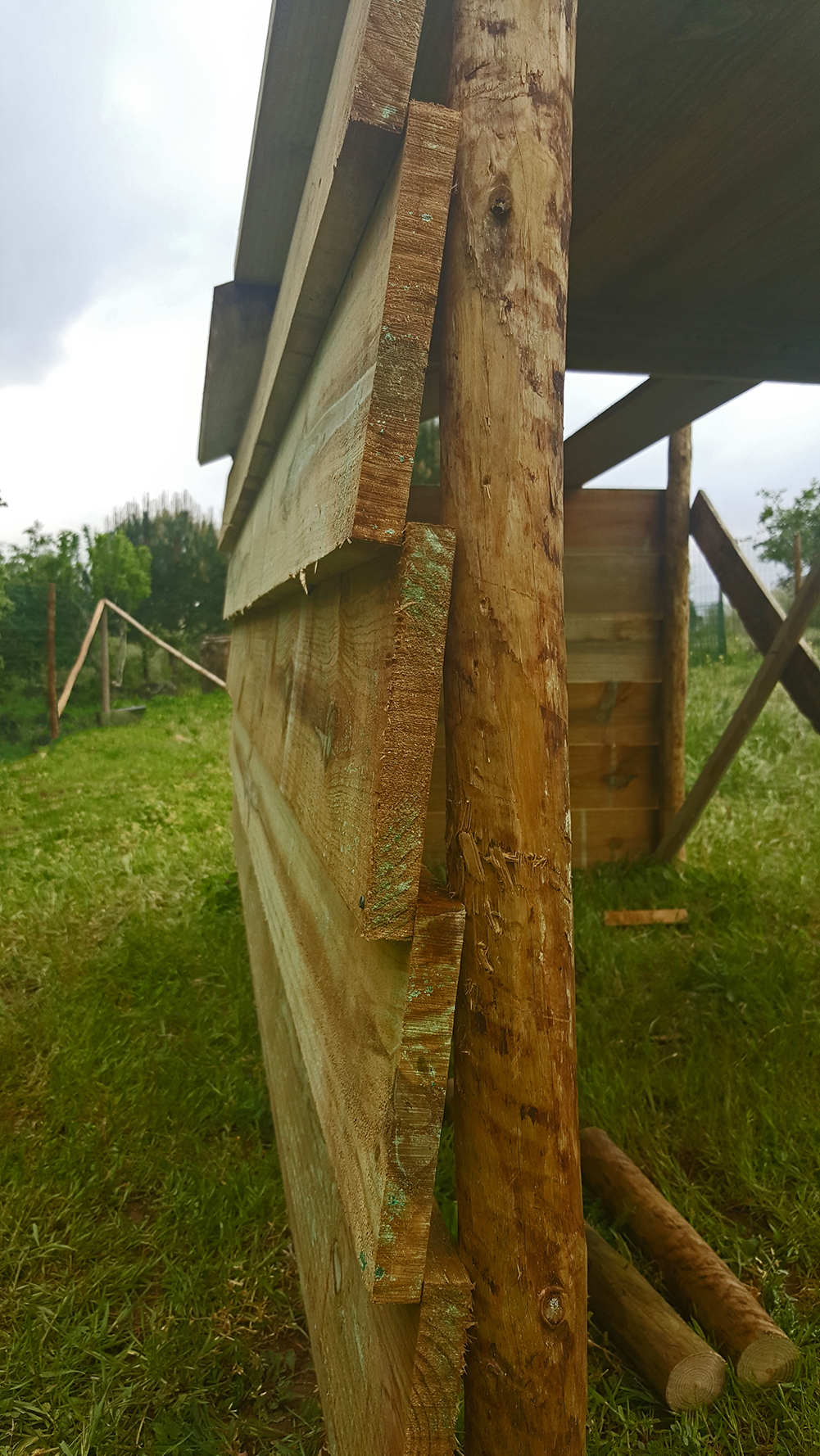 Als straks de geiten los mogen lopen in de kraal die we aan het maken zijn, dan moeten ze wel kunnen schuilen, voor de regen en voor de zon. We maken een geitenschuilplaats. Ze moeten ook een beetje kunnen spelen, we maken daarom ook een plateautje waar ze op en af kunnen springen. Het hoeft niet helemaal potdicht te zijn want het moet ook goed kunnen ventileren. De geiten moeten er ook tegen kunnen schuren en springen, het moet een beetje stevig zijn. We hebben dikke planken gekocht en die hebben we gepotdekseld. Een techniek die een beetje lijkt op werken met rabatdelen, misschien is het wel een voorloper ervan. ’t Werd vroeger wel gebruikt om het werken van het hout als het vochtig wordt of juist droog, een beetje op te vangen, want de planken kunnen langs elkaar schuren. Met planken van 20 cm breed schiet het lekker op en een wandje is zo gemaakt. De palen staan niet zo ver in de grond, wat het in eerste instantie een beetje gammel maakt, want een gepotdekselde wand kan nog steeds scharnieren. Als alles eenmaal staat kijken we wel of het stevig genoeg is of dat er hier en daar nog een schraagje tegenaan moet. Voorlopig moeten de geiten er snel kunnen staan want dat scheelt een hoop gedoe, zeker op regenachtige dagen als ze steeds naar binnen en naar buiten moeten.