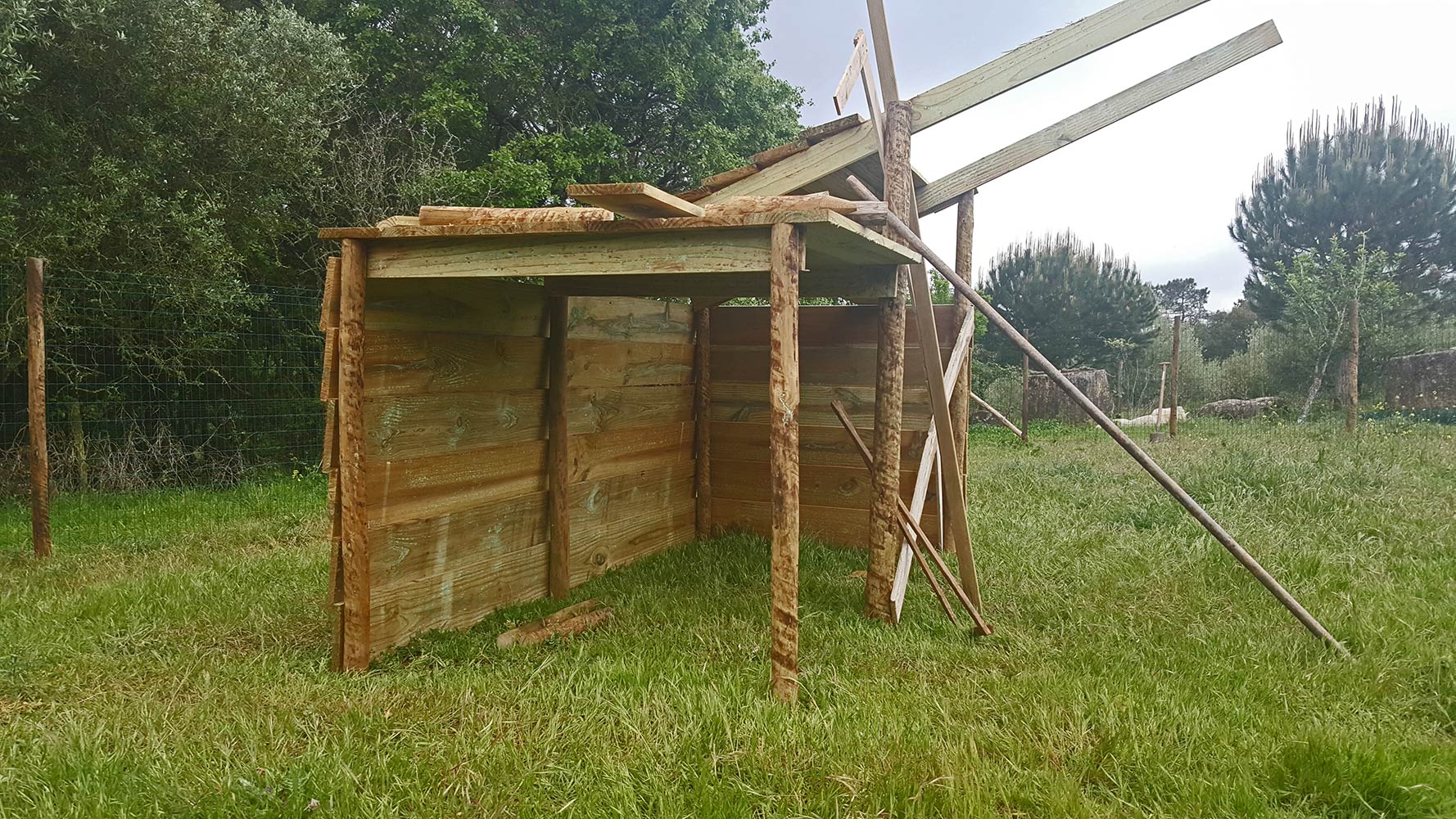 Het is nog niet klaar, maar het schiet op. De geiten kunnen wel al schuilen en klimmen. Op het dak moet nog één plank en we moeten nog controleren op gammelheid, de schuine stukken onder het dak moeten nog geplaatst worden, maar dat zijn eigenlijk details. Het belangrijkste voor de korte termijn is dat er een poortdeur komt in de opening die we uitgespaard hebben in de omheining. Nog twee dagen te gaan, voor de vaccinatiereis. Met een beetje geluk gaat dat morgen wel lukken, maar we worden de laatste dagen overvallen door regen, ook al voorspelde buienradar dat niet. Morgenochtend zou het droog moeten zijn, misschien lukt het. Al het materiaal is in huis op de scharnieren na. ’t Wordt ook wel tijd, want vandaag hebben Isabela, Beatriz en Inês de hele dag op stal gestaan, het dreigde de hele dag en af en toe viel er een flinke plensbui, als het eenmaal klaar is, kunnen ze gewoon buiten blijven, ondanks de regen.