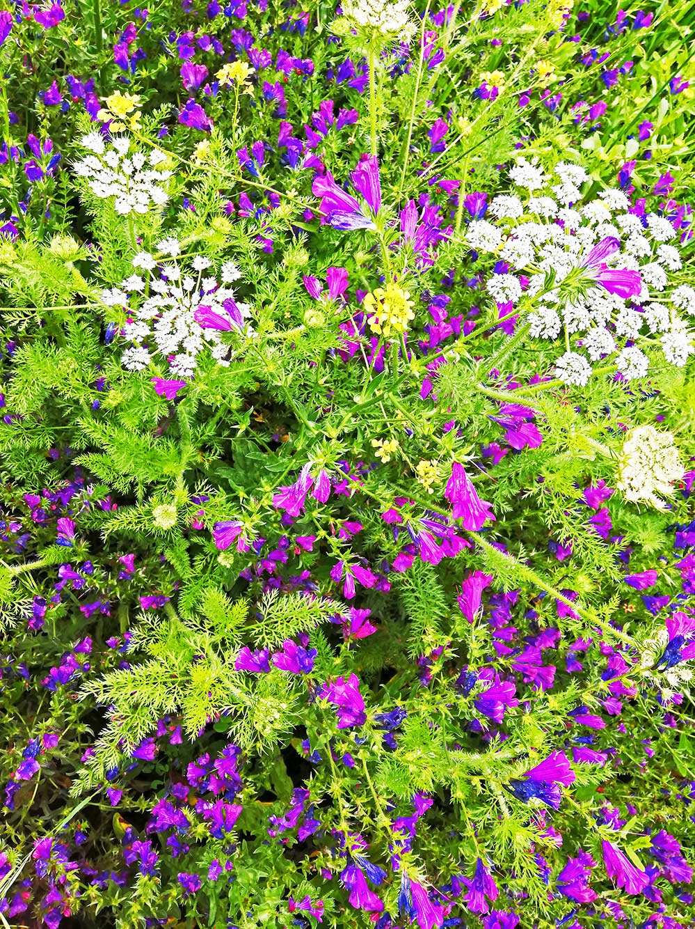 Een gedeelte van het terrein maaien we niet als er bloemen staan te bloeien. Ook de Isabela, Beatriz , en nu ook Inês laten we daar niet grazen, tijdelijk dan. Het resultaat is dat er nu een bloemenzee is ontstaan van wilde bloemen. Het is er een drukte van belang met bijen en hommels in alle soorten en maten. Als je er langs loopt hoor je het aan alle kanten zoemen. Het staat zo vol en de planten komen zo hoog dat er geen doorkomen aan is, zo dichtbegroeid is het nu. Straks, na de bloei, gaan we er weer flink met de bosmaaier doorheen om het weer begaanbaar te maken, maar voorlopig genieten we van al de kleuren en al die insecten die het aantrekt.