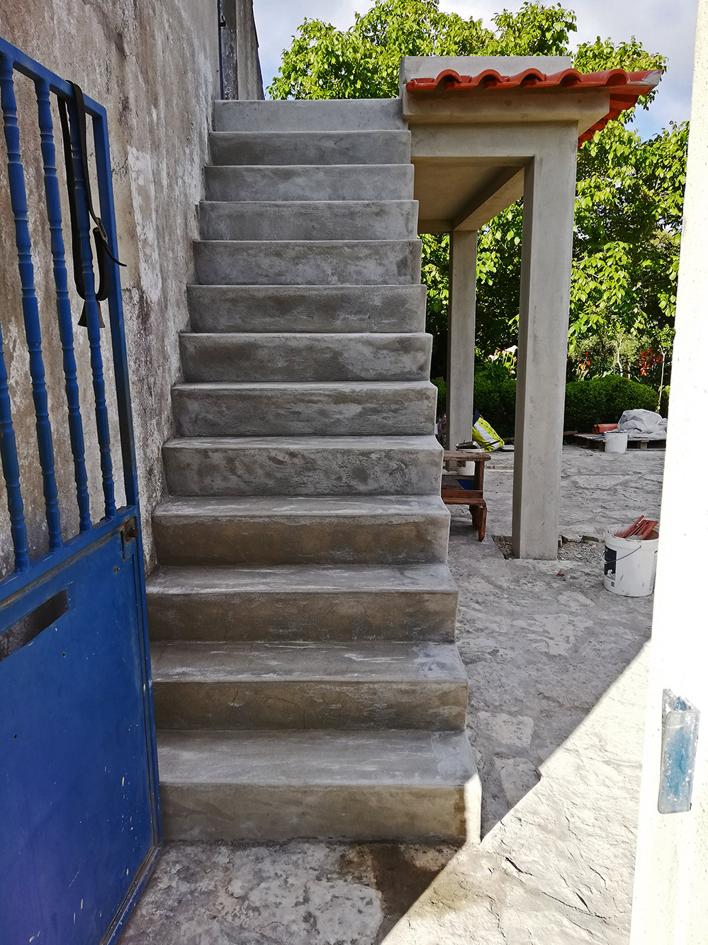 Het heeft even geduurd, maar er is weer wat. Door het slechte weer, voornamelijk regen, heeft het een tijdje stilgelegen, maar vandaag is de laatste hand aan het stukwerk gelegd. Nog een heel gedoe, want we wilden niet dat de trap vergeven zou zijn van de kattenpootafdrukken. Hier en daar een pootafdruk is wel schattig, maar honderden is wat overdreven. De katten moeten daarom een dagje binnen blijven, tijdens het stuken zelf en tijdens het drogen en uitharden. Een aardige opgave met katten die normaal de hele dag het terrein en de omliggende velden afschuimen. Het is allemaal gelukt en de trap en het platje is helemaal klaar. Voor wat betreft het werk van Joaquim en Ilídio dan, want er moet nog wel geverfd worden, maar voor nu kunnen we weer wat afvinken.