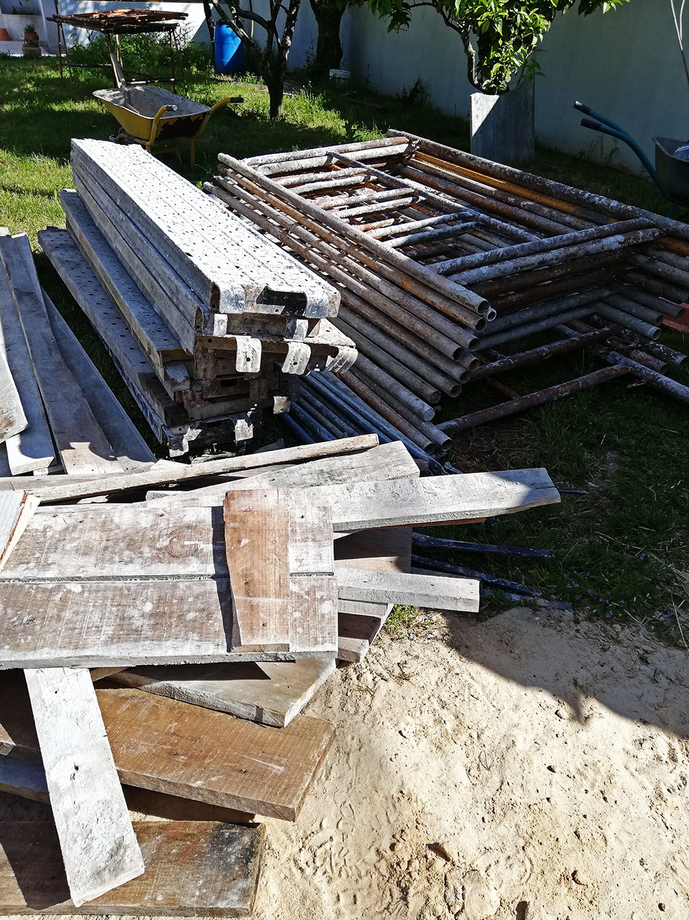 En een nieuw stilleven! Was de ene stapel rommel/grondstoffen/gereedschap nog niet opgeruimd of prompt werd er vanmorgen een hele kar vol met steigers gebracht. En er komt nog meer bij. Cement, zand, bewapening, dakpannen, betonmolens, je weet wel de hele constructiemikmak. Joaquim en Ilídio zijn klaar met de trap en Pedro met zijn trawanten komt maandag beginnen met het vervangen van het dak van het oude huis. Dat bestaat nu uit oude balken waarop direct de pannen zijn gelegd. Die pannen liggen hier en daar scheef en daarom lekt het ook. Is allemaal niet zo erg, want er staan niet echt goede spullen op de plaats waar het lekt, maar uiteindelijk willen we van het oude huis een volwaardige ruimte maken en dan is een goed dak wel een voorwaarde.