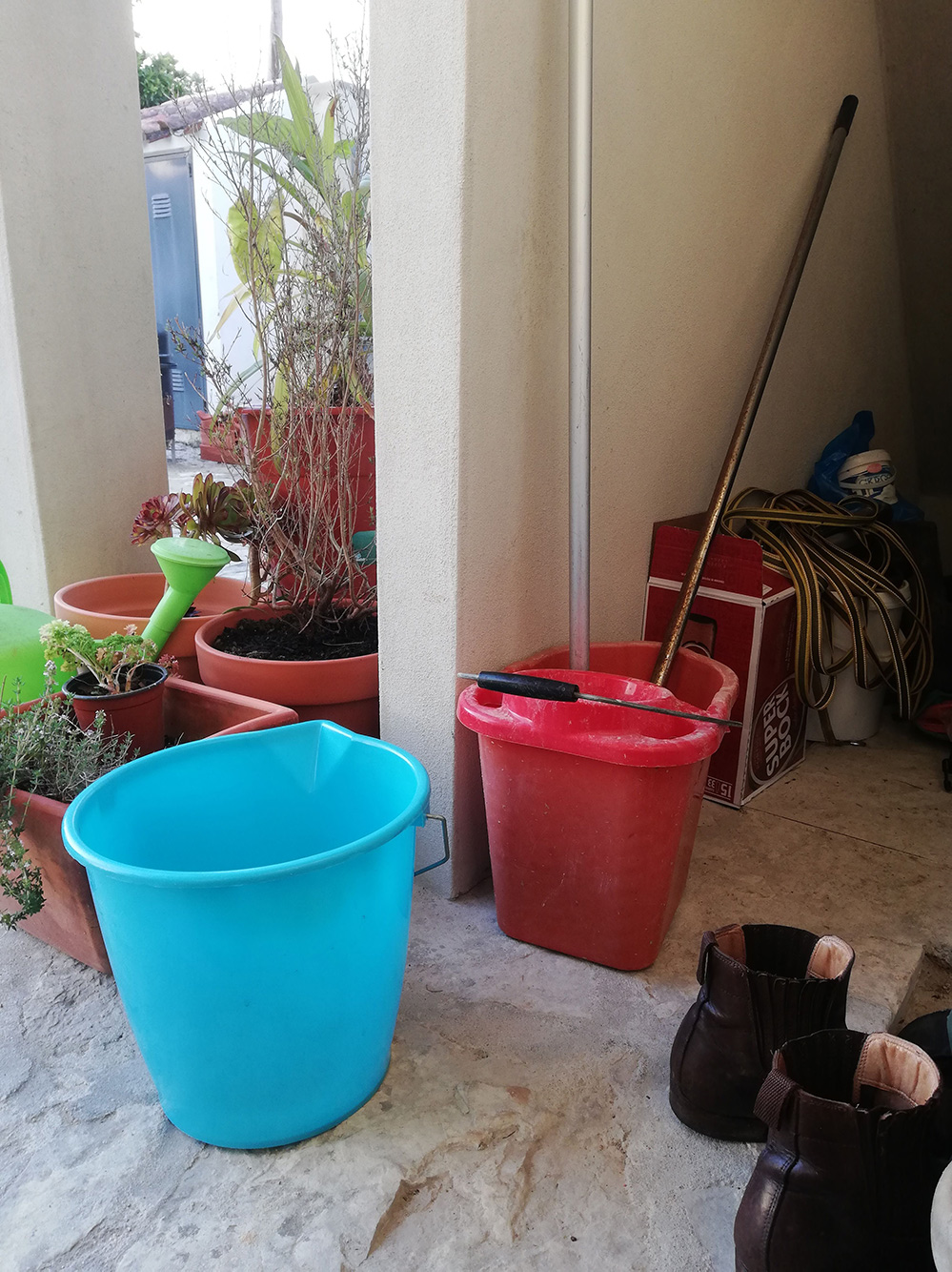 Van het waterballet hebben we in de consternatie geen foto gemaakt, alleen van de emmers en mop vanochtend.