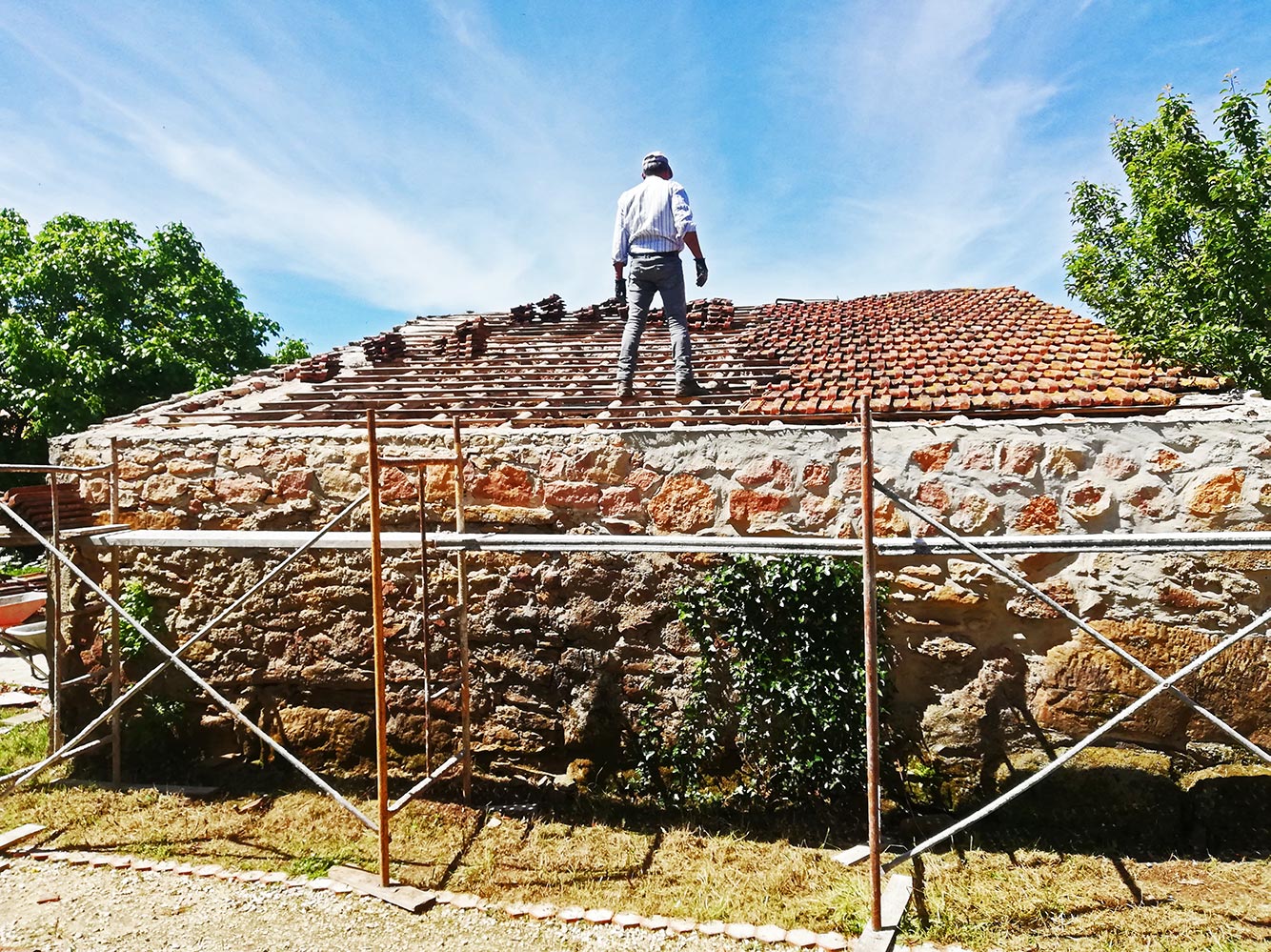 En ze zijn begonnen! Vanochtend om acht uur kwamen ze aanrijden, we hadden net de honden gelopen en zaten een beetje met ze te spelen. Het zijn José Louis en António, twee rasechte Portugezen. Ze kleppen de hele dag door, vooral José Louis (Zé Louis, zegt-ie zelf), maar ondertussen wordt er wel gewerkt. Ze beginnen met de dakpannen van het dak te halen. Het is bijna 90 m², dus dat zijn een hoop pannen. De hele pannen willen we bewaren voor ornamenten op het terrein, afscheidingen en zo. De gebroken of beschadigde pannen gaan we verwerken en het puin, de stukken cement gaan we weer gebruiken om gaten te vullen van funderingen en zo. Er wordt niets weggegooid. Het betekent wel dat de mannen meer moeten doen, normaal gooien ze alles op een stapel en voeren het dan af, tenminste als je dat wilt. Nu moeten de pannen op het gestapeld worden in stapeltjes van vier, dan naar beneden doorgegeven, aangepakt, op de kruiwagen gelegd en een stukje verder opgestapeld. Maar de mannen hebben er zin in, het is lekker weer, niet te warm, beetje wind, ze zitten nooit verlegen om een praatje en ze vinden het fantastisch dat we ze nog een beetje kunnen verstaan ook. António geeft ongevraagd tips, over hoe je bomen moet snoeien. Ze handen jeuken bij het zien van de perzikboom en hij vraagt toestemming om er een paar takken vanaf te zagen. Ze zijn dood, zegt-ie of bijna dood en als we vruchten willen hebben moeten ze eraf. Hij heeft er kijk op want de takken die afgezaagd worden zijn inderdaad voor meer dan de helft droog. Hij biedt zelfs aan om in December, Januari terug te komen om de andere bomen ook te helpen snoeien. Hij is eigenlijk smid van beroep.
